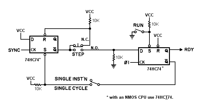 The manual for the Apple 1 has a single-step circuit using just a single 7474. It's somewhat obscure (to me, at least), so I redrew it in a way I find clearer. Also, with the CMOS 'HC74 in mind, I added some pullup resistors and Vcc connections which aren't strictly necessary with the TTL part.