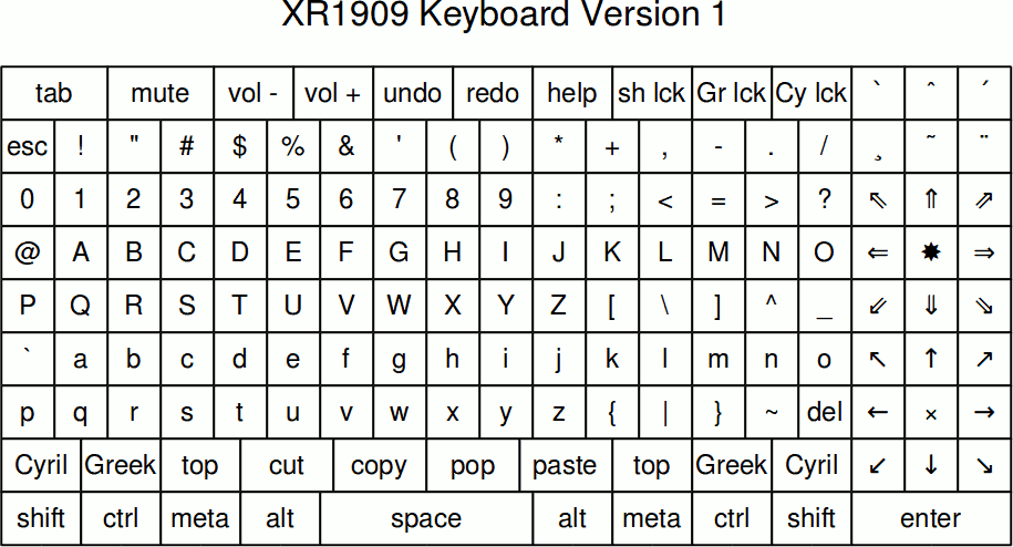 For custom keyboard design, I strongly recommend drawing a proposed layout, printing it on paper and then trying various scenarios. You'll look crazy typing on paper but it will save you considerable expense and effort with an unfavorable design. My preferred arangement is likely to be someone's idea of purgatory. Specifically, I'd like a straight run, six row ASCII chart with seven space cadet meta keys, accent keys and arrows. This requires about 160 keys and is definitely too extreme for many people. However, there are many claims about "programming keyboards" which require one or two meta keys to perform basic functions, such as typing brackets. XR1909 true programing keyboard which may be partially made from XR0225 keyboard tiles. Most importantly for programmers, it allows round brackets, square brackets, curly brackets and angle brackets to be typed without meta keys. The result looks like a Chinese typewriter but it is not intended for general use. I've been careful to ensure that the design only requires keys of six different sizes. This will hopefully reduce the cost of double-shot key molding (or 3D printing equivalent). I've also been careful to ensure rectangular perimeter. Even if you're laser cutting a keyboard enclosure, this will save you time and effort.