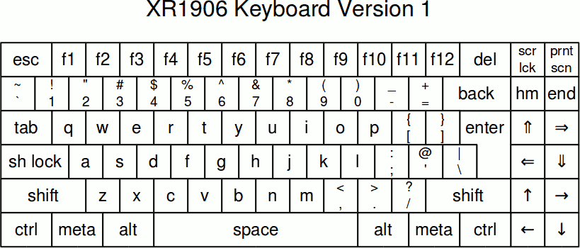 For people who prefer a slightly more conventional keyboard, XR1906 is a psuedo PC keyboard may be partially made from XR0230 keyboard tiles and is a mix of historical 8 bit Commodore and contemporary US layout. It has 12 undefined function keys, reduced cruft and is without numeric keypad. I believe this would be described as 80% keyboard. If function keys are omitted, the quantity of keys is much more similar to 8 bit Commodore hardware, although arrow keys are notably improved. The arrow cluster is splayed such that a hand approaching at a diagonal obtains a logical arrangement of four arrow keys. The relevant strips of keys can be reversed or duplicated such that arrows may be used equally well with left hand, right hand or both. Again, I have ensured that the perimeter is a rectangle, that only six keys sizes are required and that meta keys on both sides are symmetrical. I honestly don't care if the meta keys are textured but some are the same size and may be common to both designs.