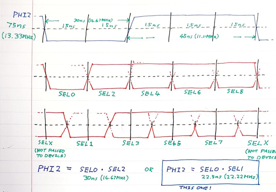 PHI2 is just SEL0 OR SEL2. Or at least it is in this picture. I've since shortened the low part of the cycle even further and I am using SEL0 OR SEL1. (Can a W65C816S6TQG-14 handle the timings above? I pretty certain it can. Can it handle them at 3.3V? uh, I hope so)