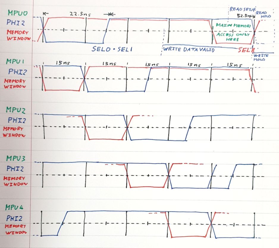 I think the principle seems sound. Each '816 can operate entirely independently of the others without ever having to wait for a chance to access memory. The actual timings I've presented here are best case and are generated using a 67MHz clock giving each '816 an effective 13.3Mhz operating frequency. The asymmetric duty cycle means the low cycle will be running at an effective 22.2Mhz which, again, will probably be fine for the W65C816S6TQG-14 at 3.3V. I think I'm more likely to run into issues in the 15ns memory access time.