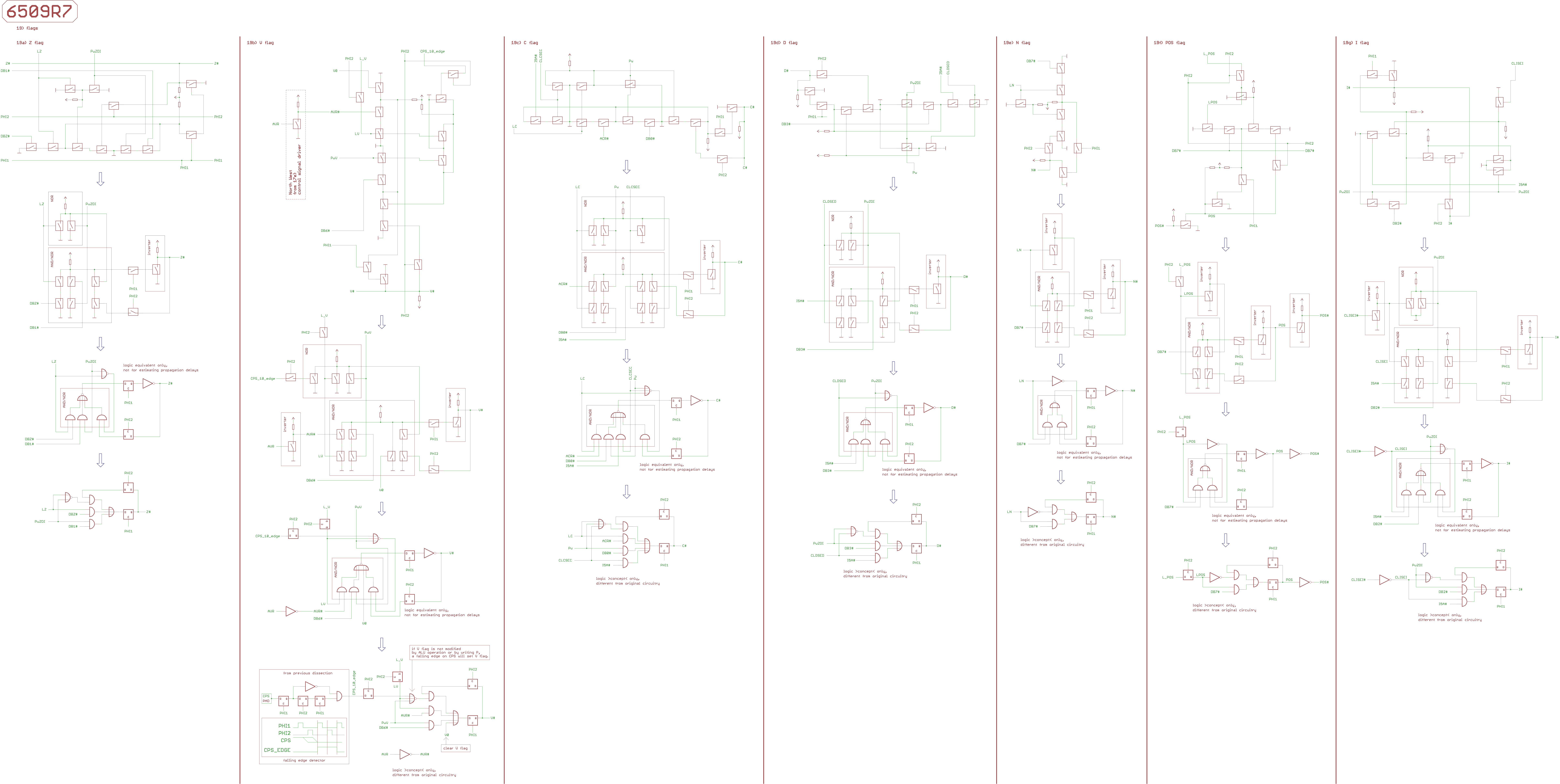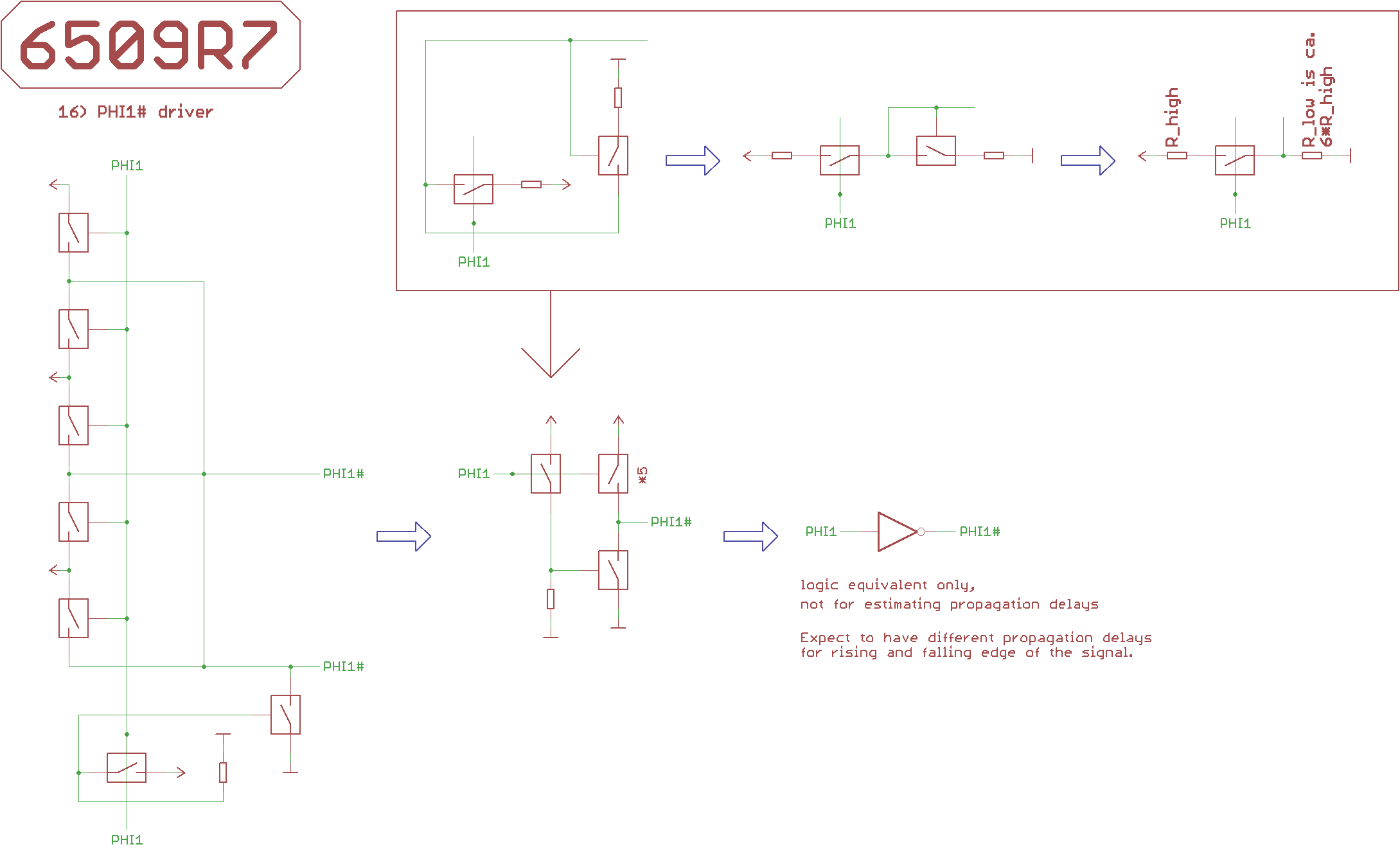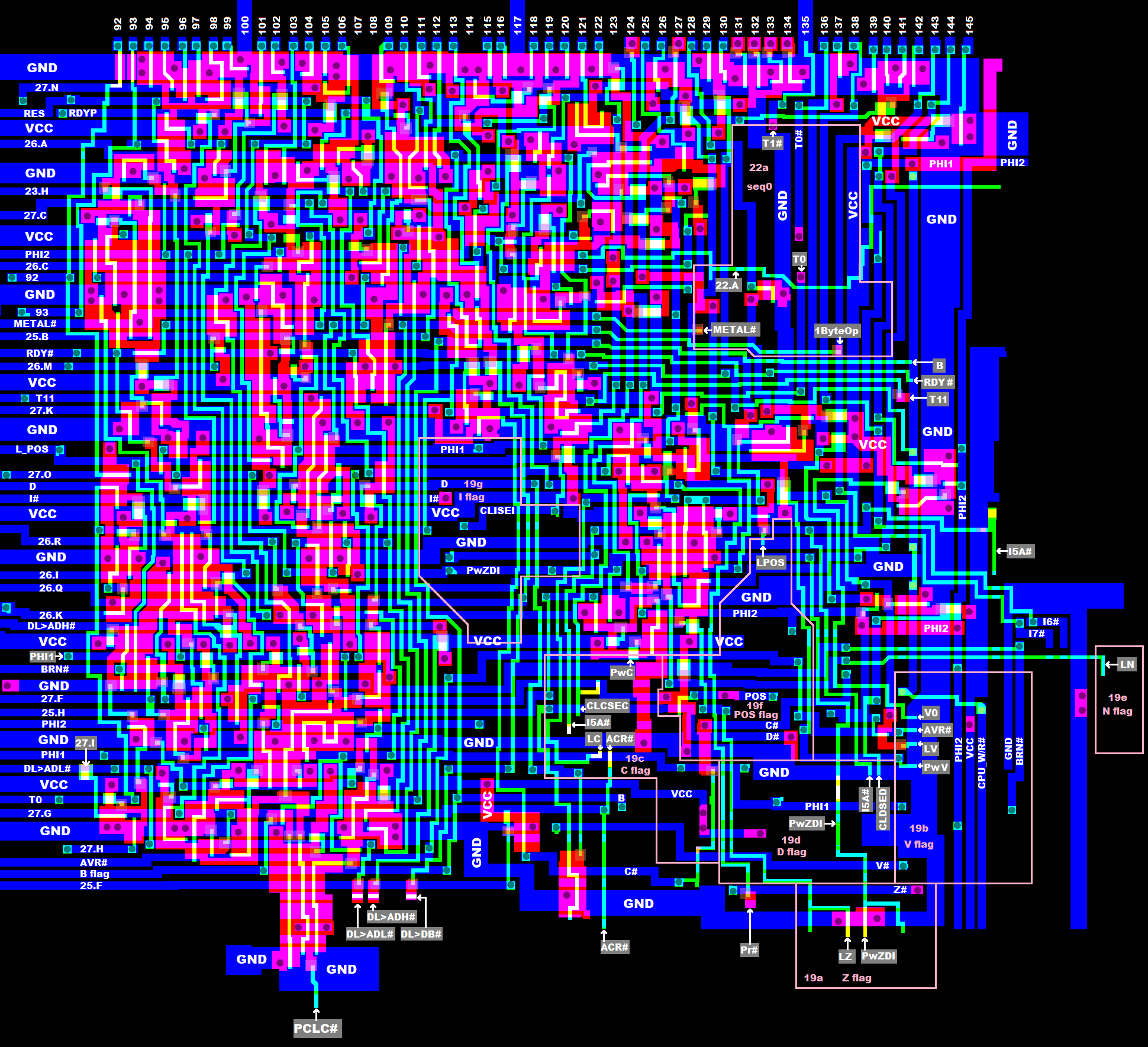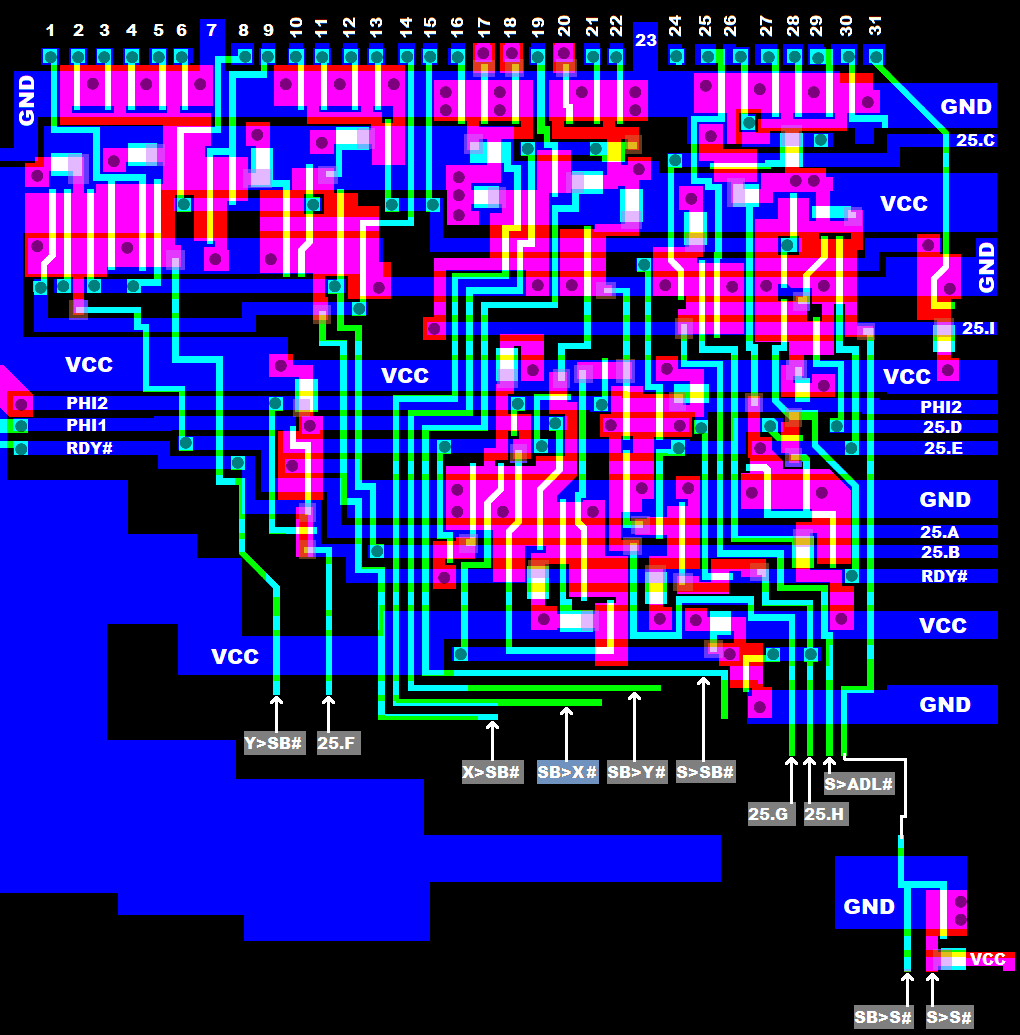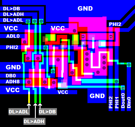Note, that the 4 internal bus systems ADL, ADH, DB, SB are precharged to 1 by FETs during PHI2.