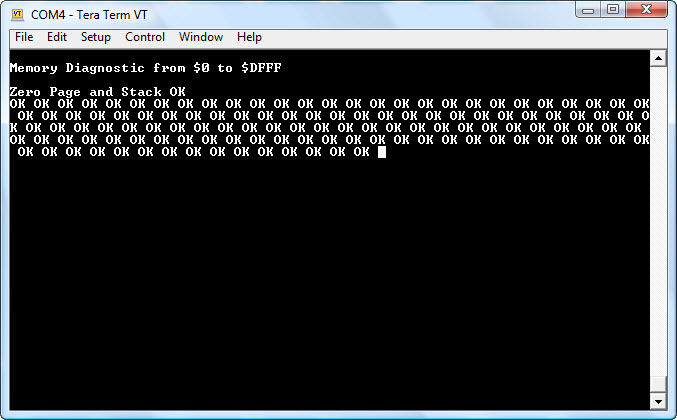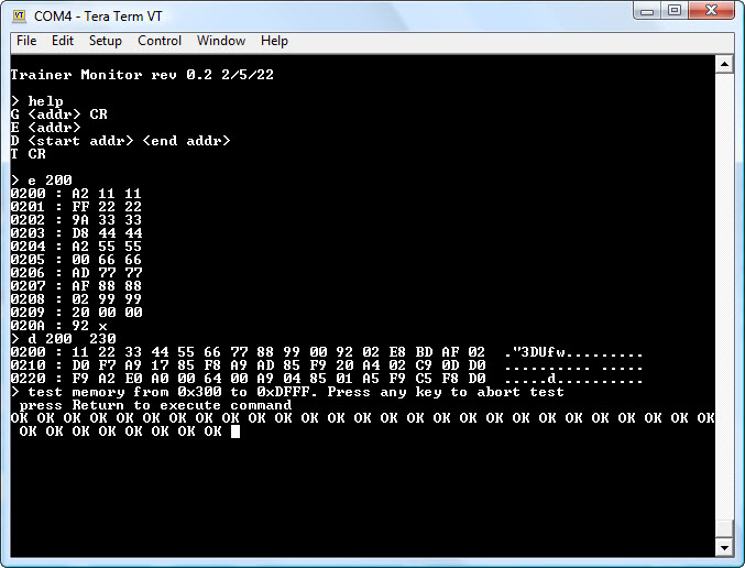 Below is screen capture of a simple monitor for the 6502 SBC and source file attached. This monitor has the four basic functions of load file, display memory, modify memory, and run program. I also added the memory diagnostic routine from the previous session. It is not much, but has sufficient functions to load and run better programs.