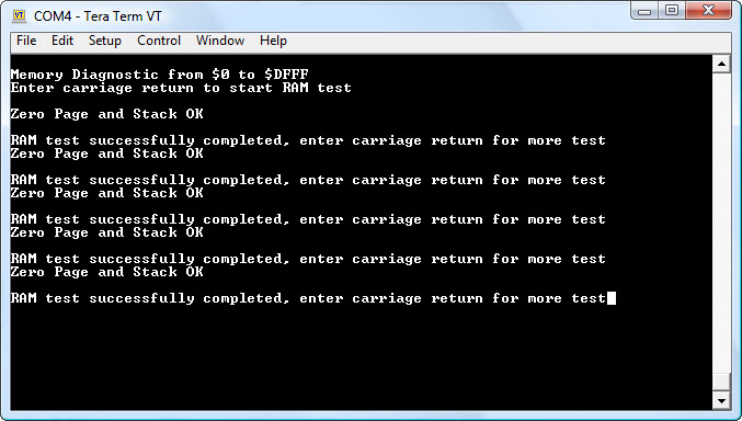 This is a RAM diagnostic that first checks the zero page and stack ($0-$1FF) without using any RAM resources. Once ZP and stack tests passed, it uses ZP and stack to run full RAM test from $200-$DFFF. RAM test is attached. The hardware has successfully passed RAM diagnostic at 7.37MHz.