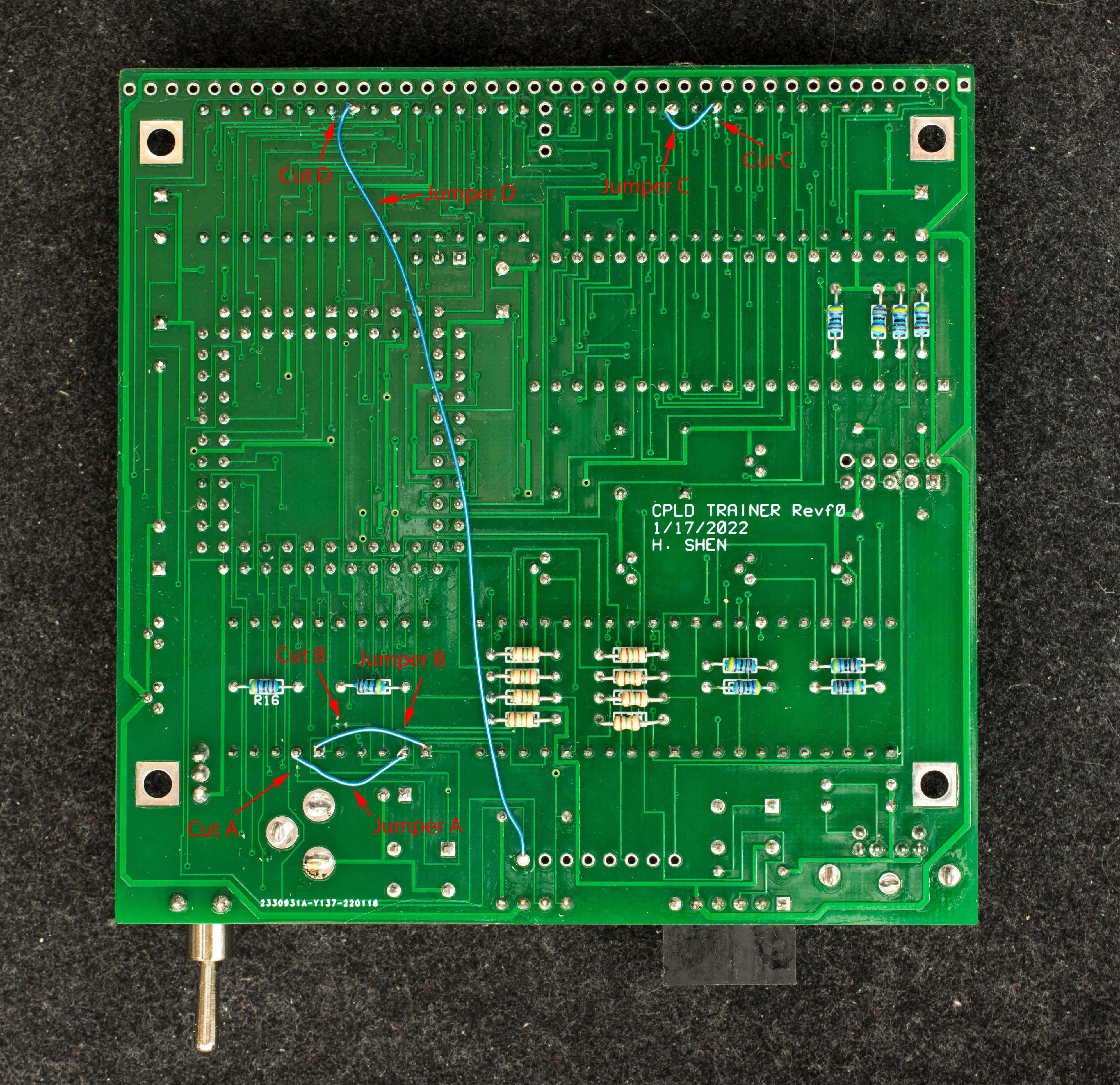 Attached is the schematic of CPLD. The mode latching logic, ROM data path, and external flash memory controls are similar to the block diagram described in Part 1. The external flash memory requires independent chip_select, output_enable and write_enable control signals. In current board design flash memory's chip_select and output_enable are tied together. So it is necessary to cut the trace between flash chip_select and output_enable and connect a spare output to flash output_enable. See "Cut D" and "Jumper D" of the attached picture.