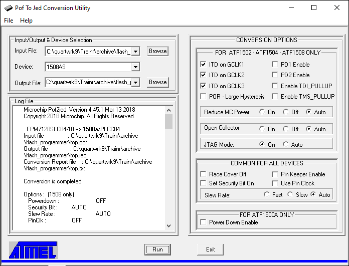 EPM7128S is the heart of CPLD6502 trainer but it is obsolete even though it is still possible to acquire them in the secondary markets. Atmel ATF1508AS is currently in production and is the replacement with the same pin assignments and logic organization. However, ATF1508AS is more expensive, requiring a different and more expensive programmer, and using a buggy WinCUPL tool. Instead of designing with WinCUPL, it is possible to design in Quartus, convert to Atmel equivalent with POF2JED, and program with Atmel programmer. This translation process is not problem-free. In the past, specifically with 64-macrocell EPM7064S, I've had success translating simpler designs to Atmel's equivalent, ATF1504AS, but the translation failed with more complex designs. I want to try again with translation of EPM7128S to ATF1508AS, so I bought and received 3 ATF1508AS ($11 each) from Mouser. The ATDH1150USB programmer is even more expensive now at $73, but I already has purchased one.