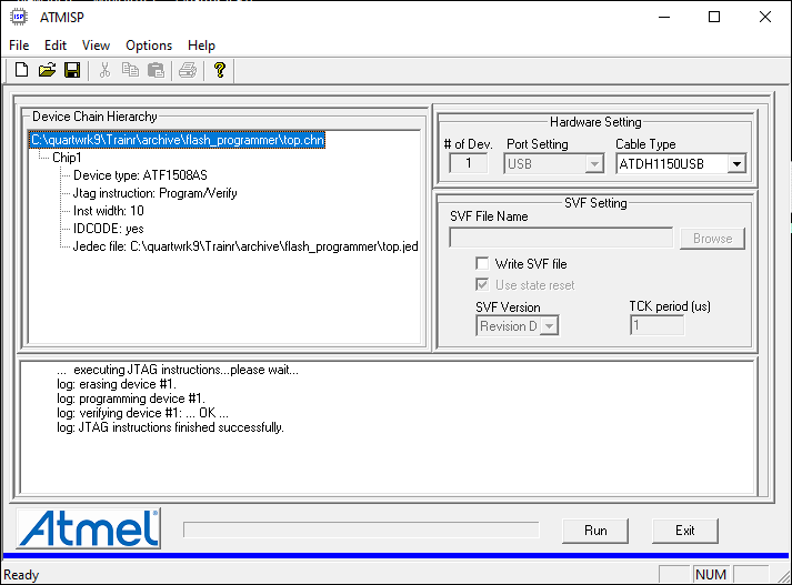 endmoduleI compiled and programmed the CPLD; verified it will boot from external flash in normal mode and when "Single Step" button is depressed while powering up, the console will receive a "<" prompt indicating the serial port is waiting for input. So it is ready for Part 3, loading of flash programming algorithm and data.