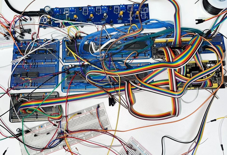 Does your build still look like this (below)? If so, you have <ahem> some tidying up to do! It's not just a matter of the length of all those cables. It also matters (a lot!) how the power and ground pins of your IC's get interconnected. For starters, cables between boards need to include at least one ground conductor (and ideally a power conductor too), attached to the local ground/power at each end. There are other requirements, too.