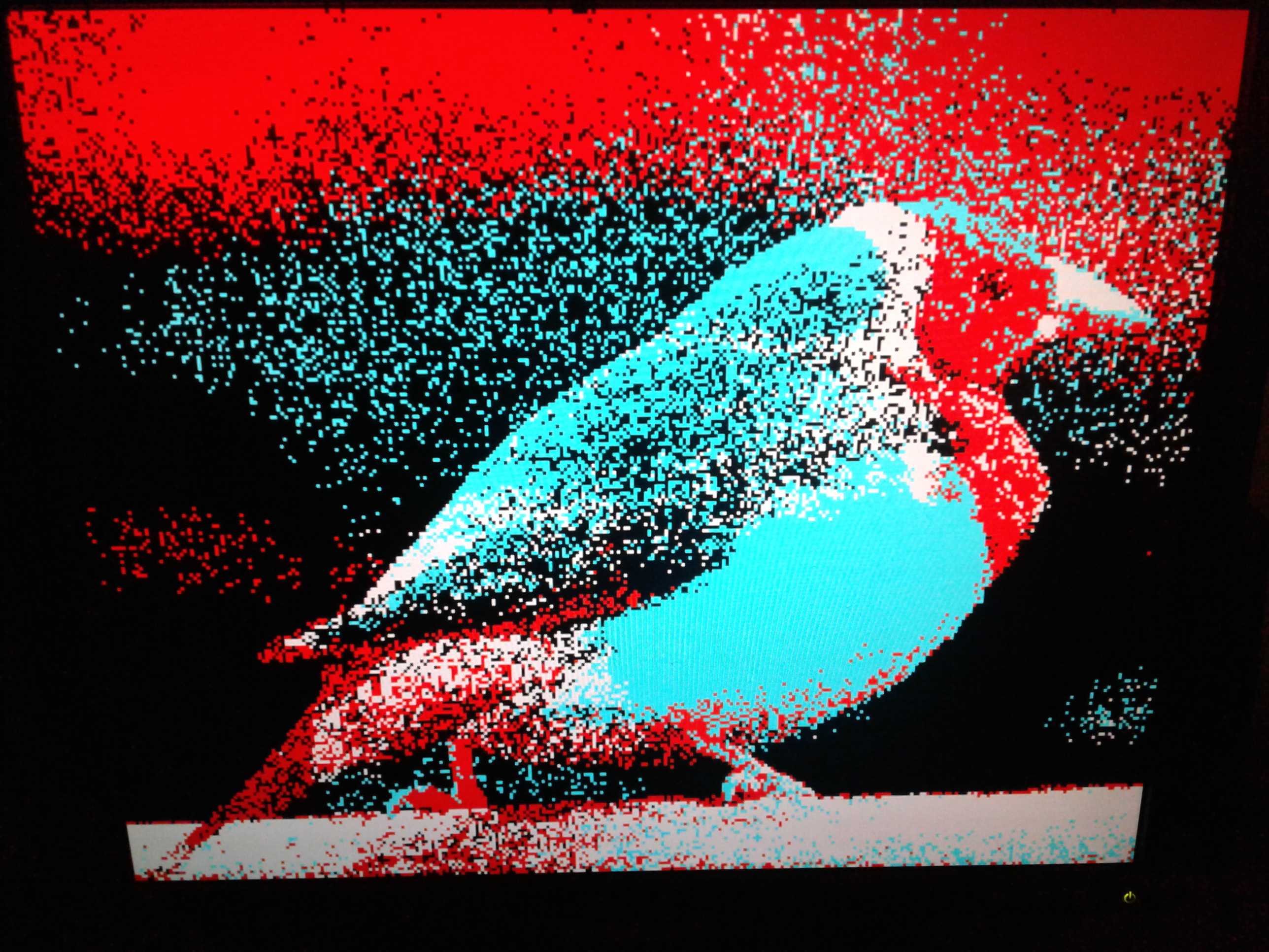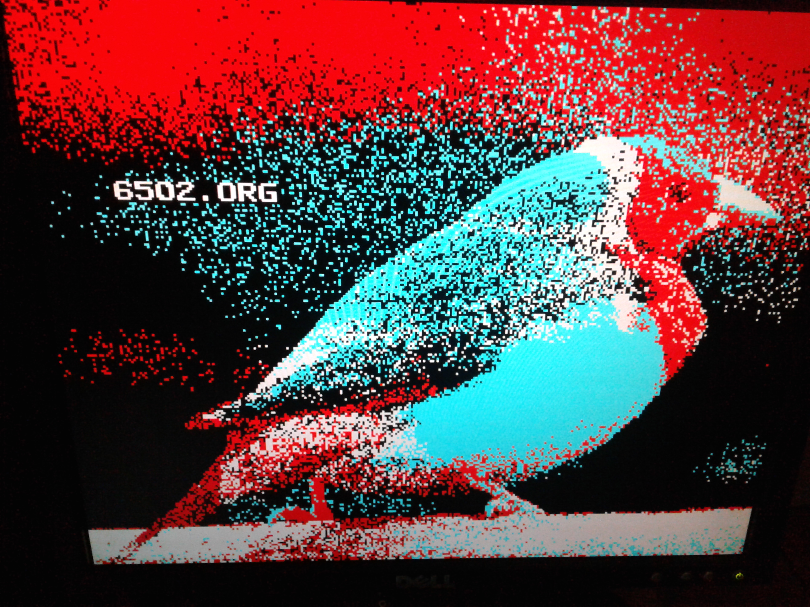 I took the picture from the internet and ran it in GIMP. Scaled to 320x240, indexed to 4 colors, back to RGB, color mapped to my particular 4 colors. Ran it through my converter program for hex values, dumped them into an .asm file with a short program copying ROM to Video RAM. Done!