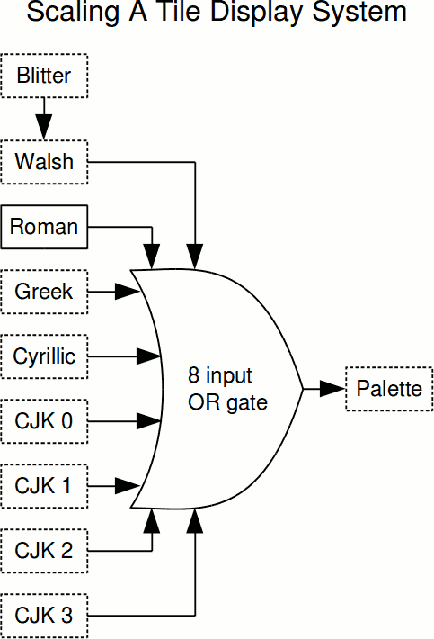 It might be useful to configure the eight palette planes for 10 bit per channel color or possibly allow color emoji with reduced palette range. The color planes should be written in a specific order for downward compatibility. Actually, all planes should be written in a specific order for downward compatibility. Specifically, the Roman, Greek or Cyrillic plane should be written last on the assumption that a minimal, monochrome system only has one Roman, Greek or Cyrillic ROM fitted. In the minimal system, all writes are directed to one plane. In small systems, writes to most planes are ignored. For example, the following writes may be ignored or directed to the only plane: high quality background, low quality background, high quality foreground, low quality foreground, underline, accents and finally ASCII value. The last write will be the most significant data; possibly with the chroma and decoration discarded.