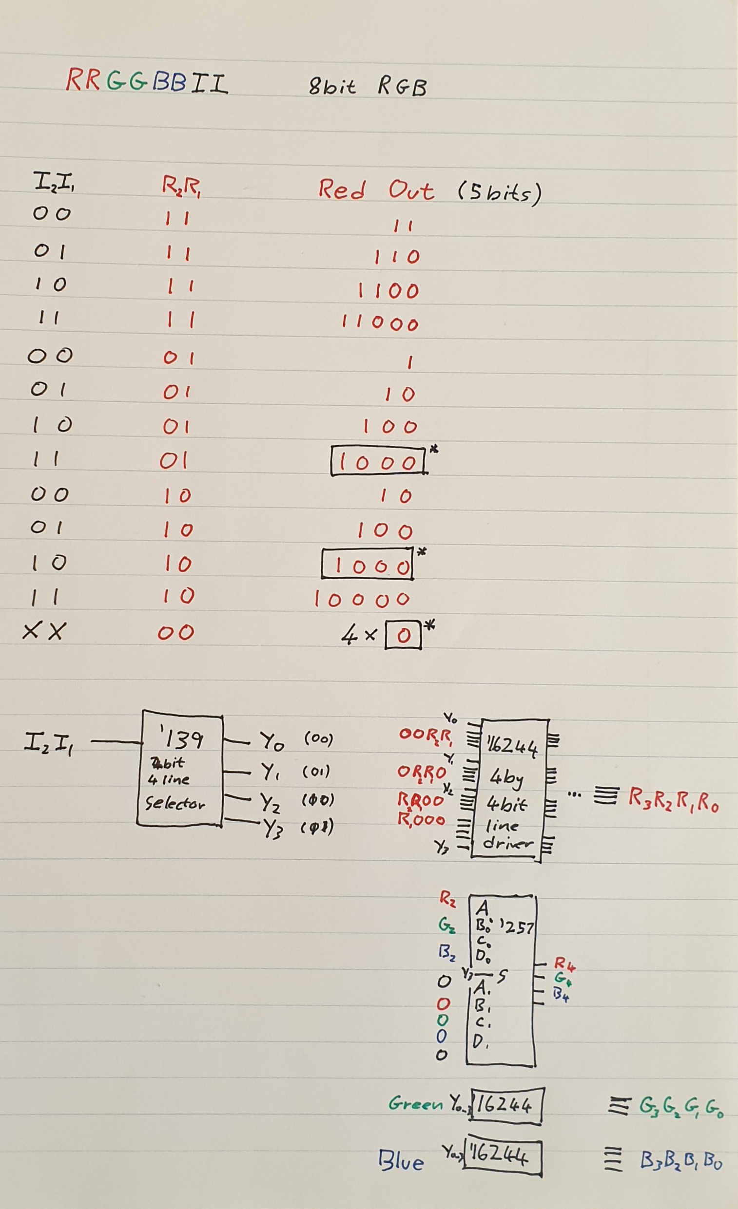 Do the same using another '16244 for GREEN. And another for BLUE. This gives us 12 bit colour which might be good enough if you only allow II values of 00, 01, and 10. However going 8bits RRGGBBII to 12bits R3R2R1R0G3G2G1G0B3B2B1B0 seems like a bit of a waste.