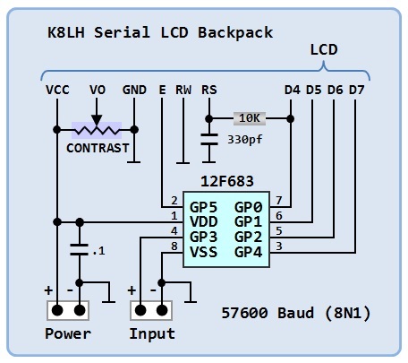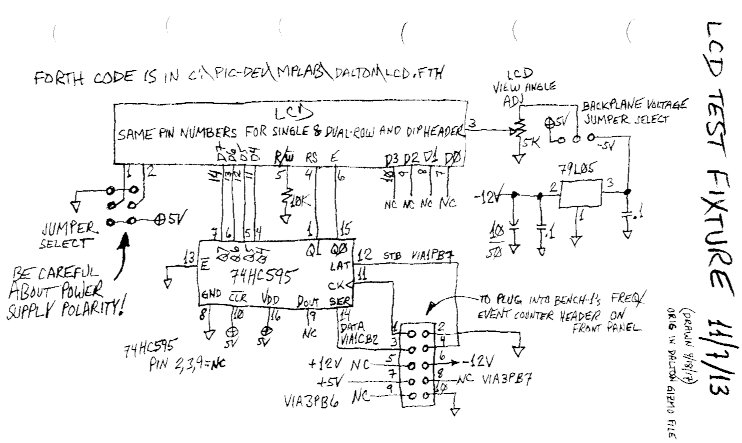 The following is a diagram of an LCD test fixture I made with connectors for various LCD brands, using a '595 and 4-bit mode.