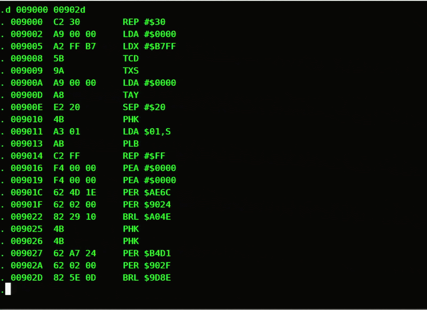 It now has a 'full' disassembler built in! The ! command makes the start of the code happen wherever the (XXXX) cursor is currently.