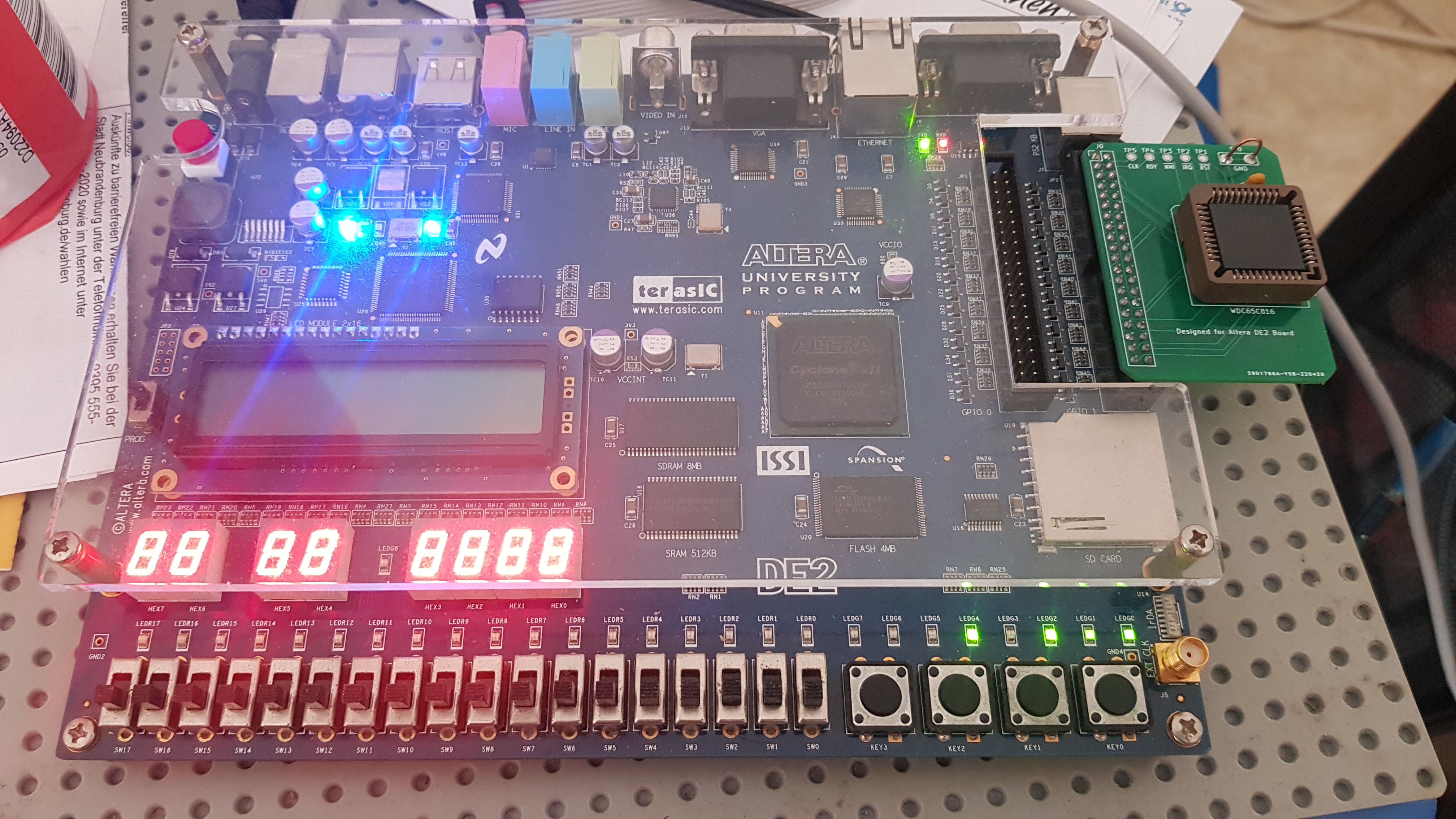 it's just a breakout board for the 65816 that plugs directly into my Altera DE2 FPGA Board. so i can do stuff with the 816 without designing a whole system from scratch. currently the FPGA only acts as a clock source, ROM, and single IO Device (An 8 bit Register hooked up to the 8 green LEDs at the bottom right)