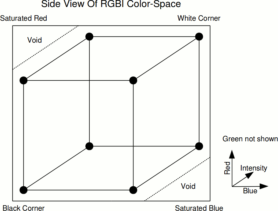 Regarding RRGGBBII, I've drawn a diagram but this may only confuse the matter. RRGGBBII is, technically, a four dimensional color-space, like CMYK. Therefore, I have omitted green and drawn a projection of red, blue and intensity on a two dimensional plane. I am not adverse to drawing a projection of a hyper-cube but it is time consuming and doesn't advance my argument.