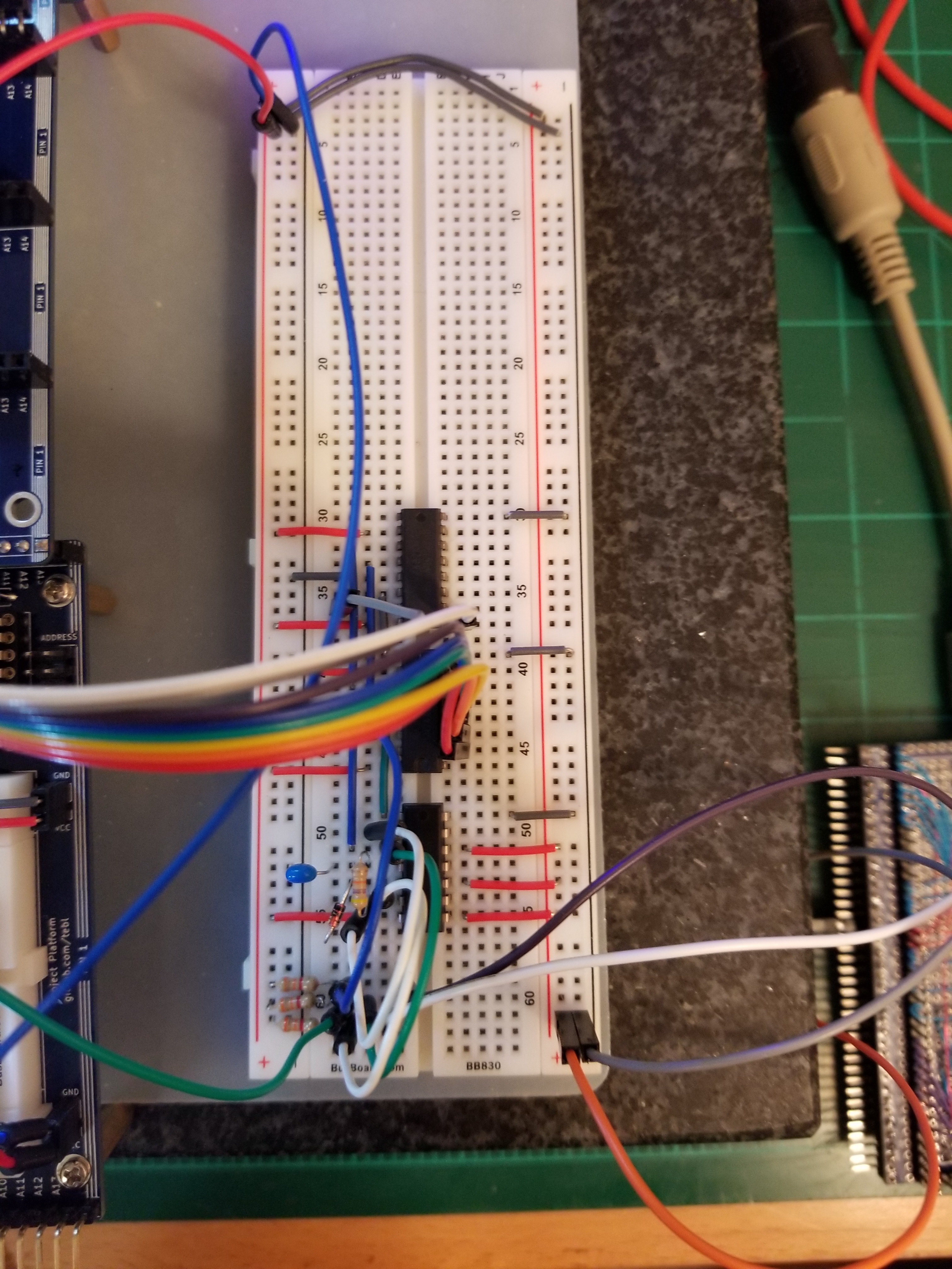 You can see that there is something conspicuously missing from the breadboard reconstruction, though - bypass caps! My wirewrap board does have a bypass cap for each IC, and I did put them on the breadboard during reverse engineering, but I took them back off again for dramatic effect. They don't seem to make any difference. But this one does: