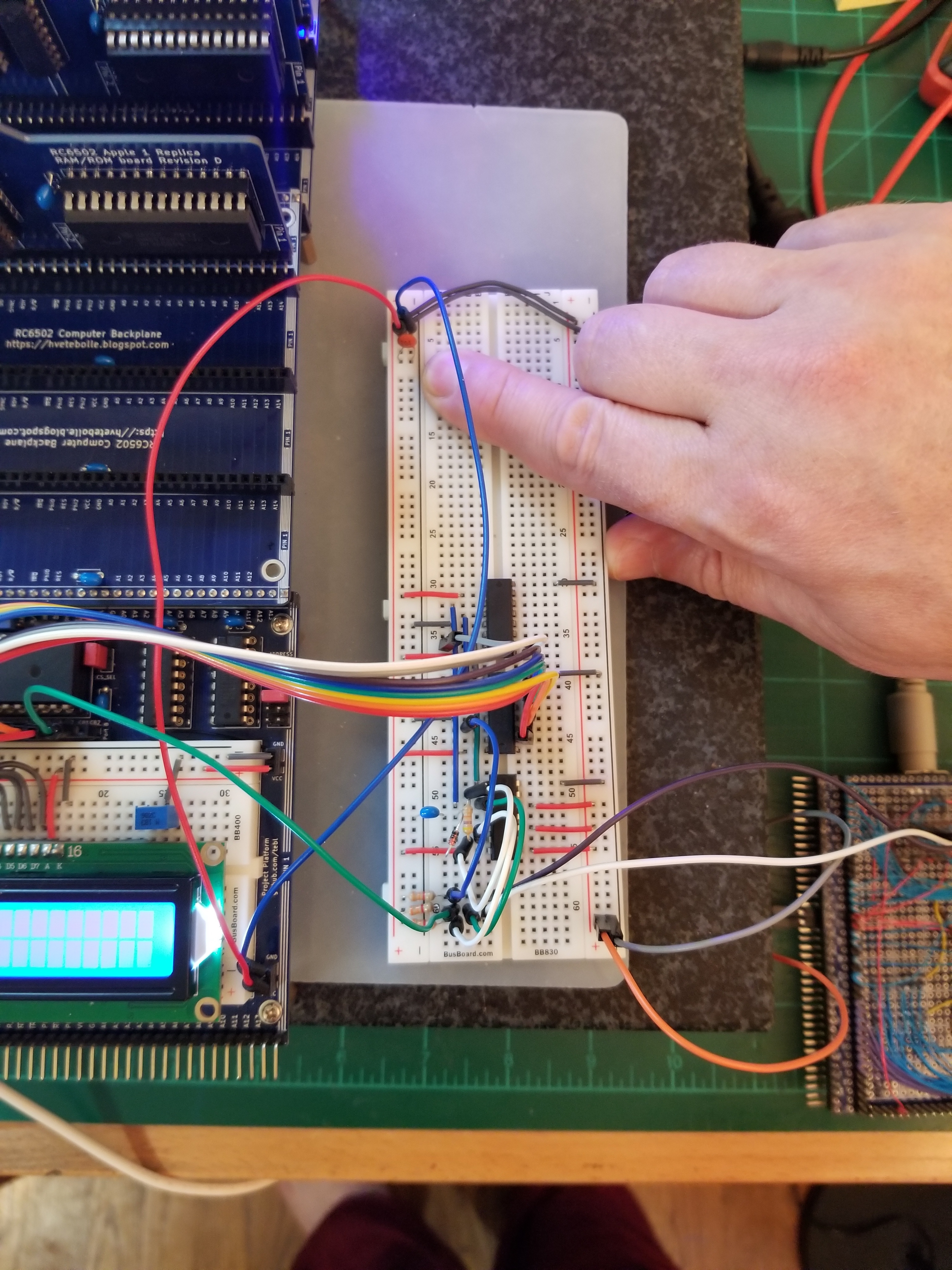 Scope or no scope, if I can get the keyboard circuit to work on a breadboard, I think I ought to be able to get it to work on perfboard. Since the two are logically identical and the only difference is in the construction, I think you certainly must be right about power / ground. The circuit is a pretty simple one - not counting decoupling capacitors, it has only 3 ICs, a diode, a capacitor, and 4 resistors. The protoboard I'm using is specifically for the RC6502 - it has the bus pins along the bottom, a GND rail across the top, and a VCC rail down the right hand side. The majority of the board is a simple grid of plated through-holes; no strips or busing.