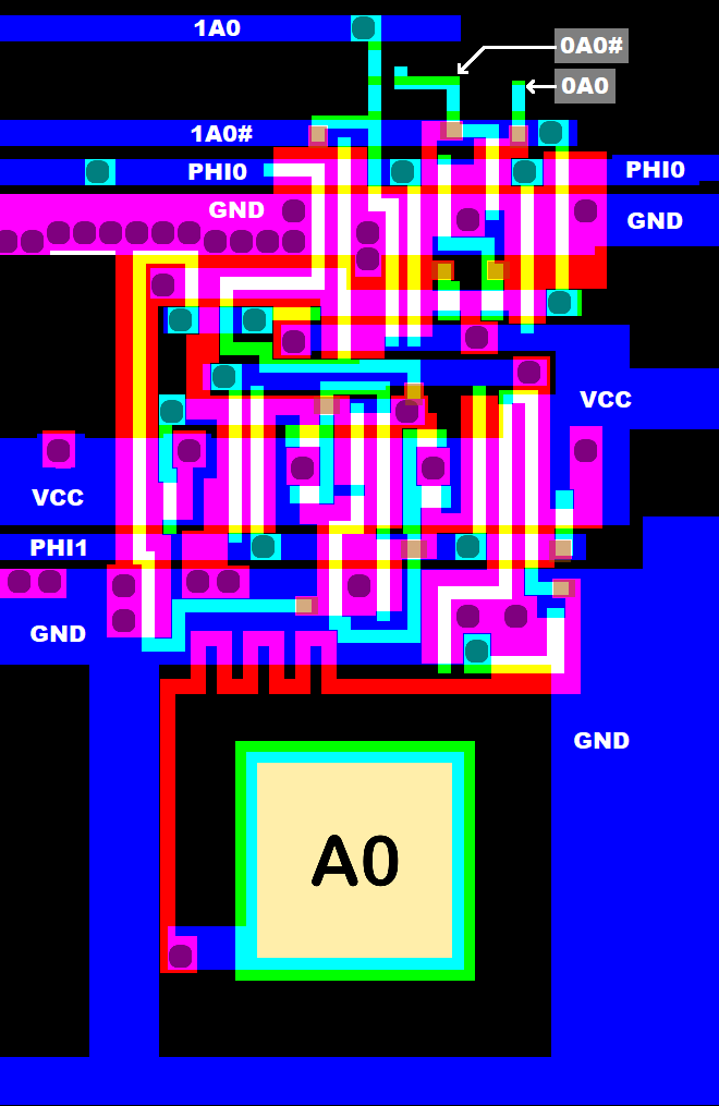 Basically, the signal from the A0 pad is sampled by a fully static transparent latch at PHI1,