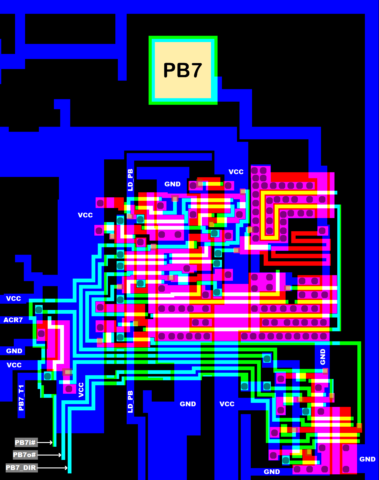 North of the shift register block, we have the usual FETs switching the control signals to GND