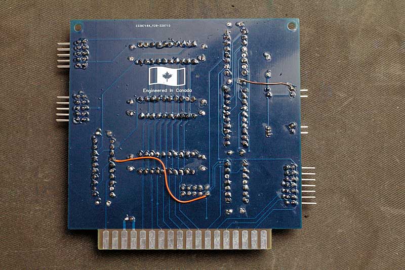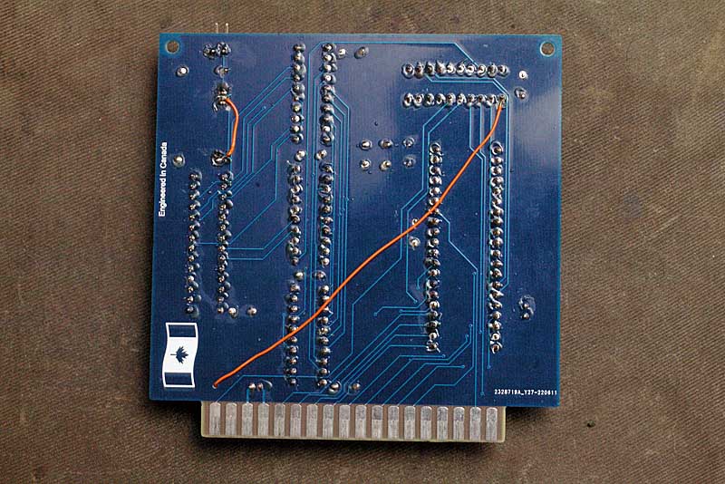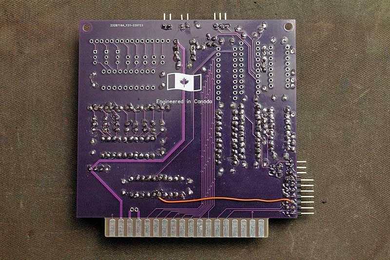 For the video card I forgot to bring the Slot Select signal from the bus to the GAL. If it was the only card in the backplane that would not be an issue. To me though that defeats the whole idea of a backplane. That's the long bodge wire. The shorter one was as a result of me trying an experiment I eventually rejected. Also, while in use I really did not like the two pin video out and wished for an RCA jack. There is a corrected and updated board on the way.
