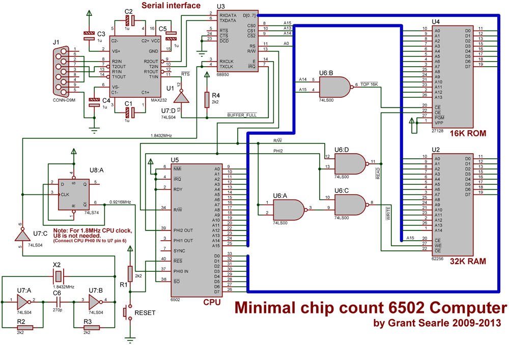 A heavier line represents a bus, ie, a whole set of connections. It should be drawn with connections coming out of it diagonally though, as if it were a bundle of wires and wires were coming out of the wrapping. See the very basic whole-computer schematic in the circuit potpourri page of the 6502 primer at http://wilsonminesco.com/6502primer/pot ... ml#BAS_CPU . You can add a UART (or even several) in that one too, with no additional glue logic, per the notes there. I would not use a 6850 though, as it doesn't even have an onboard baud-rate generator. [Edit: I see I mentioned that in an earlier post above, too.]