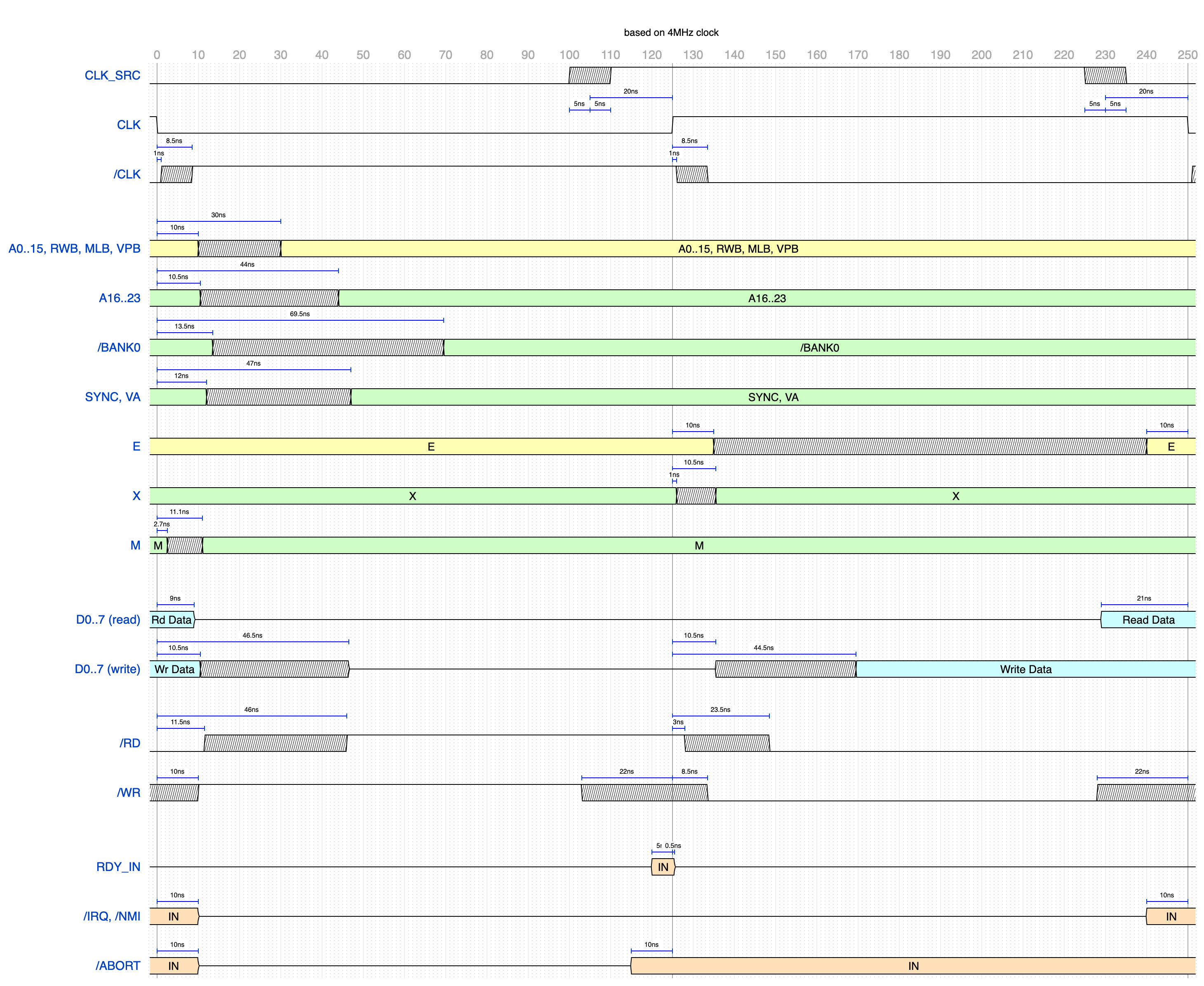 - using Bus Enable for DMA is fully supported, with the data and address buses, R/W, /RD, /WR, and VA signals being tri-stated by BE. They all have weak pull-ups/downs for default values while experimenting with BE on the breadboard.