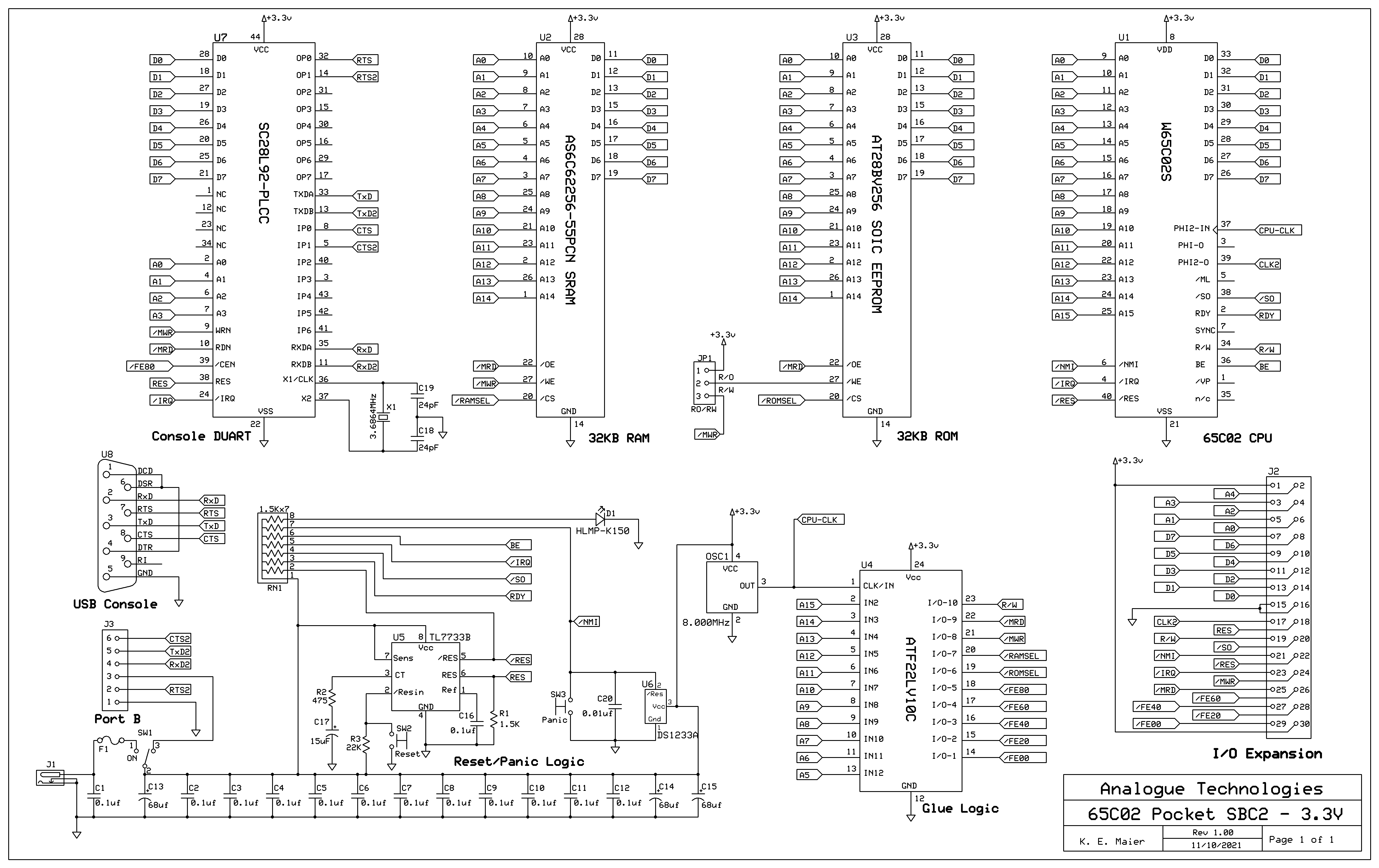 I used an extra Version 1.00 PCB I had and built up a 3.3V C02 Pocket SBC by simply changing out parts with 3.3V counterparts and resistor changes from 3.3K to 1.5K. By building up an adapter to replace the SCC2691 with a SC28L92 (which will run at 3.3V or 5V) I had a working system. I rewrote parts of my existing 3.04 BIOS to support the SC28L92 and a few minor changes the Monitor code as well. Part one done!
