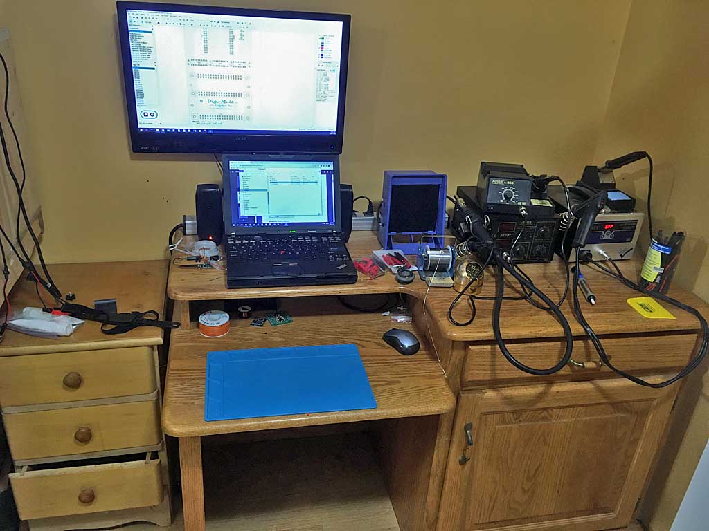 What I do today is print out some relevant spec sheet pages and put them in 3-ring binders. I also put a small laptop with a BIG screen on my soldering/assembly bench for quick look-ups and displaying layouts and schematics.