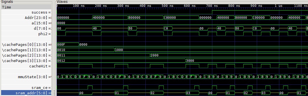 This is by no means simulating the CPU. I'm just feeding it ramdom address, similar to what a 65c816 does. Please ignore the "success" signal in the scope. Addr is the current address the "CPU" wants. a and d are the simulated 65816 address and data buses. PHI2 comes from the MMU itself.