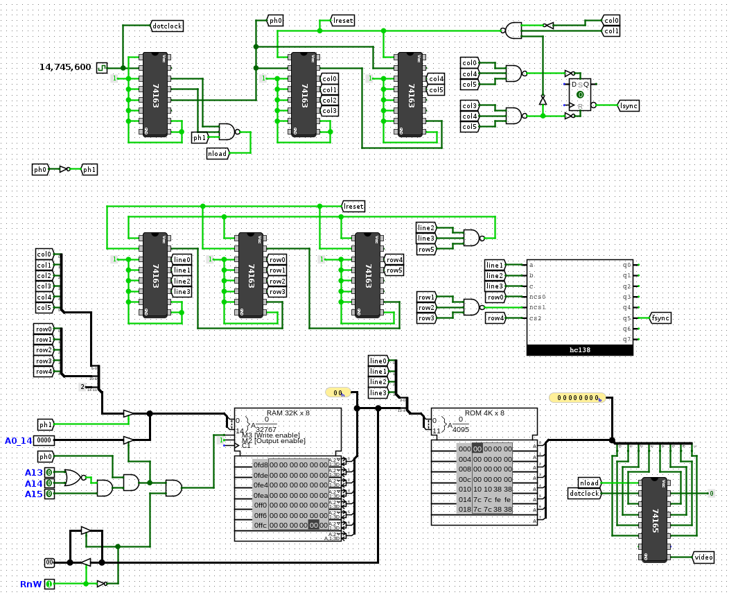 Attached is a simulation for a simple VGA output extension for a computer based on Grant Searle's minimal system - it's currently untested as I haven't built it yet, but the PCB is pretty.