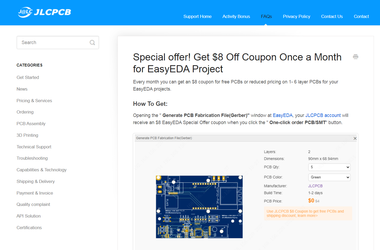 Fits nicely onto a half-eurocard (80 x 100mm), I had it made by JLCPCB who deliver quickly into Germany, even on their slowest/cheapest mail.