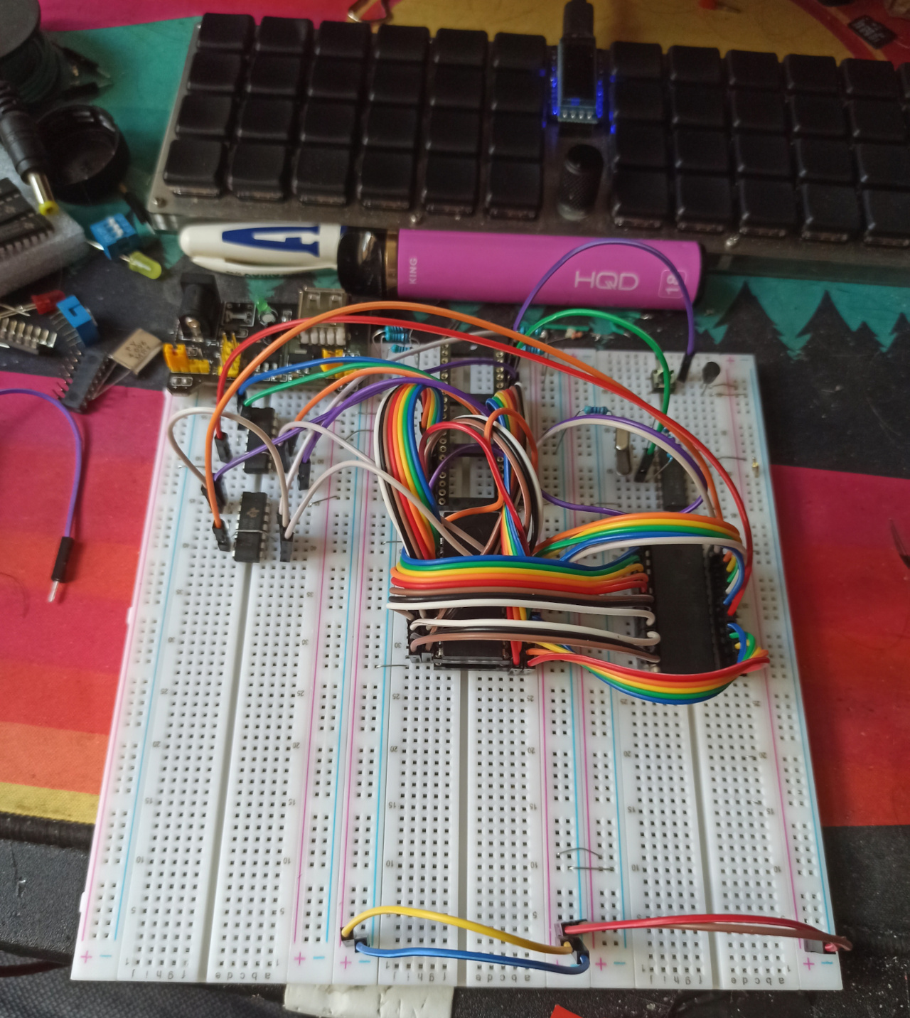 Here's a mess I've made out of my breadboard so far. My next stop is caps, RAM & the CPU itself. Might take a while before I have those parts on me...