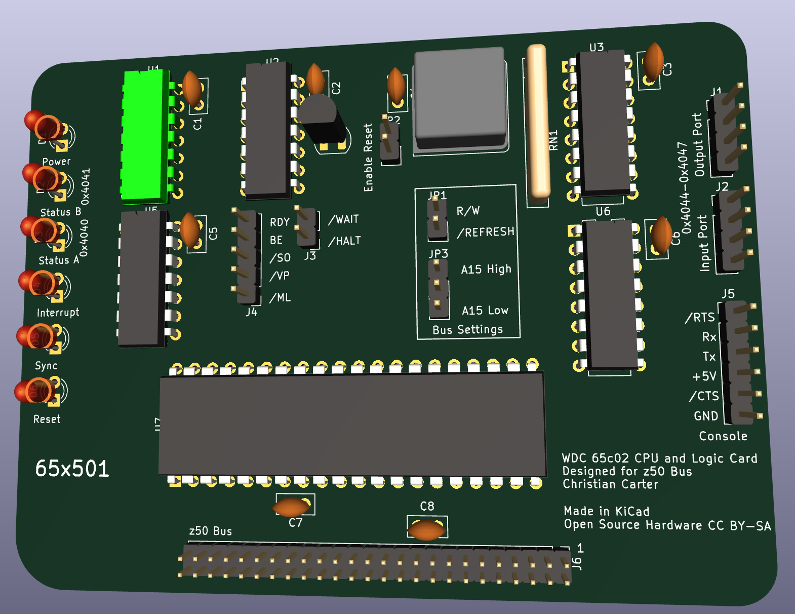 I've been enjoying my breadboard build, and an Apple 1 SBC from eBay, but I want to put copper (and my money) where my mouth is and build out some PCBs. I also own a lot of gear from the RC2014 and "Small Computer Central" ecosystems, and because of that, I've decided to design a z50 Bus card. If you don't know it, z50 is a hobbyist bus designed by Ole Lians and is well documented. Specification is here: http://linc.no/products/z50bus/.