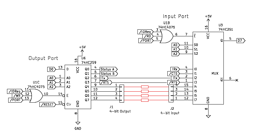There's eight 1-bit inputs and eight 1-bit outputs onboard, selected by the /PORT signal. A 74HC4075 generates /PORT as well as the chip enables (/PORT & /IOReq & the appropriate read or write). These offer a bit-banged UART, two status LEDs that can be controlled by the user program, and four bits on headers for user experiments. The output circuit comes from SCC's SC519/SC516 designs, and I just tried to flip/reverse it for the input port.