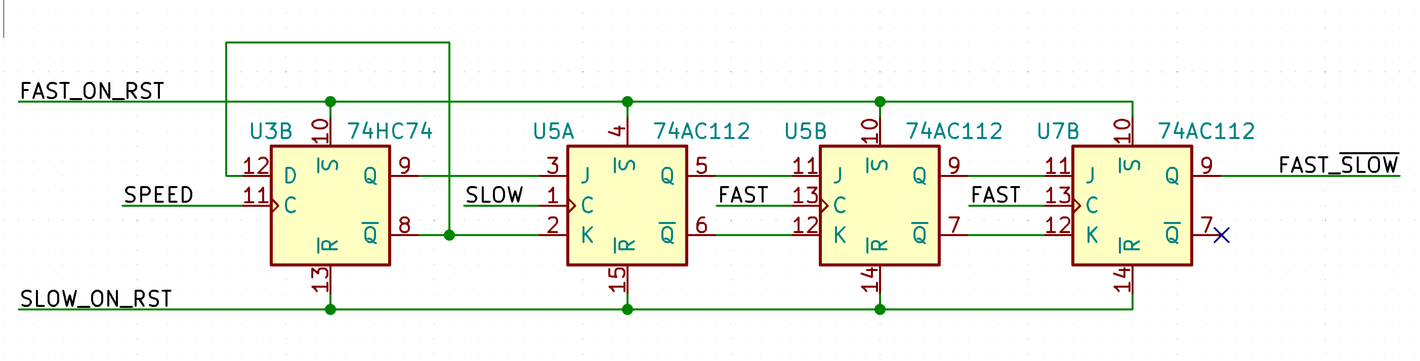 However, counter to my intuition, any signal crossing clock domains is potential error and should be checked more thoroughly. This is particularly true if multiple, asynchronous signals are involved. Multiple signals? This is the problem but it is quite minor and may resolve itself. In Speed Select, the Q and /Q outputs of SLOW section of 74HC112 connect to J and K inputs of FAST section of 74HC112. They are always intended to be opposites. Unfortunately, when FAST clocks high, they may be 00 or 11 rather than the intended 01 or 10 due to logic level asymmetry, capacitance, ringing or other cause. In this specific case, the output glitch causes a multiplexer to select one high input rather than the other high input. Therefore, this signal glitch is swallowed by all down-stream logic. Assuming that any latch oscillates or that J or K take precedence in a manner which is not deterministic, this possibly increases the minimum speed ratio between FAST and SLOW to a factor of four plus propagation delay. Maybe. Even with the restricted range of the crystal oscillator and frequency divider (as found in Episode 23! Out now!!! Don't miss it!!!!!), the minimum FAST frequency and the maximum SLOW frequency may be in a dubious range. Even here, you may switch between FAST and SLOW thousands of times without issue or have individual chips with fortunate properties.