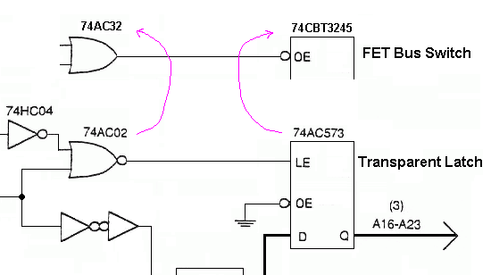 As noted, the Bank bits miraculously travel through the FET switch with near-zero delay. We could wish the switch's OE input also acted instantly; but this isn't the case -- it is subject to conventional prop delays. However, this shouldn't be seen as a point against the FET approach. You'll be obliged to account for some sort of enable delay no matter what kind of latch you use. The "win" with the FET switch is getting the Bank Address out sooner.