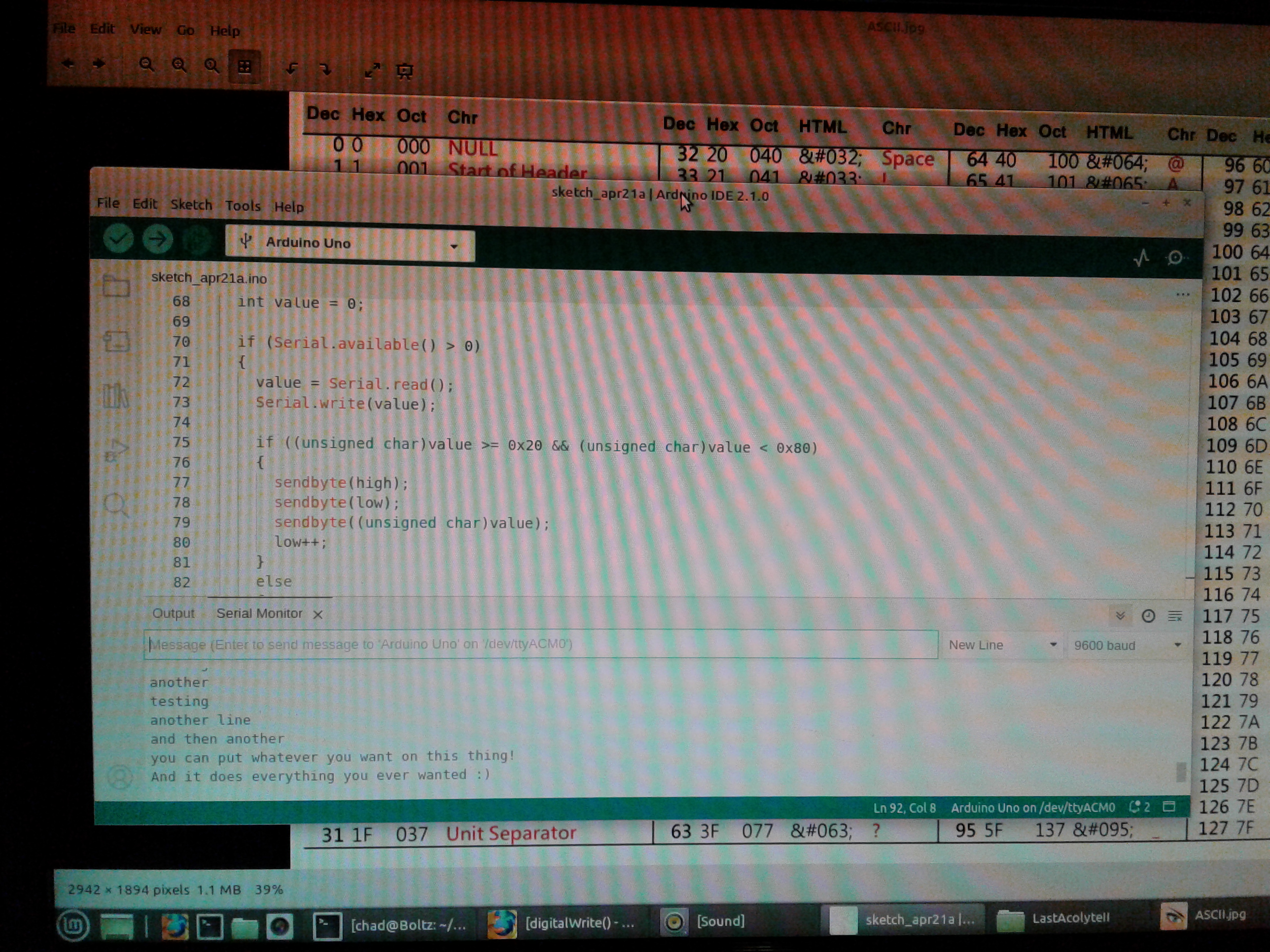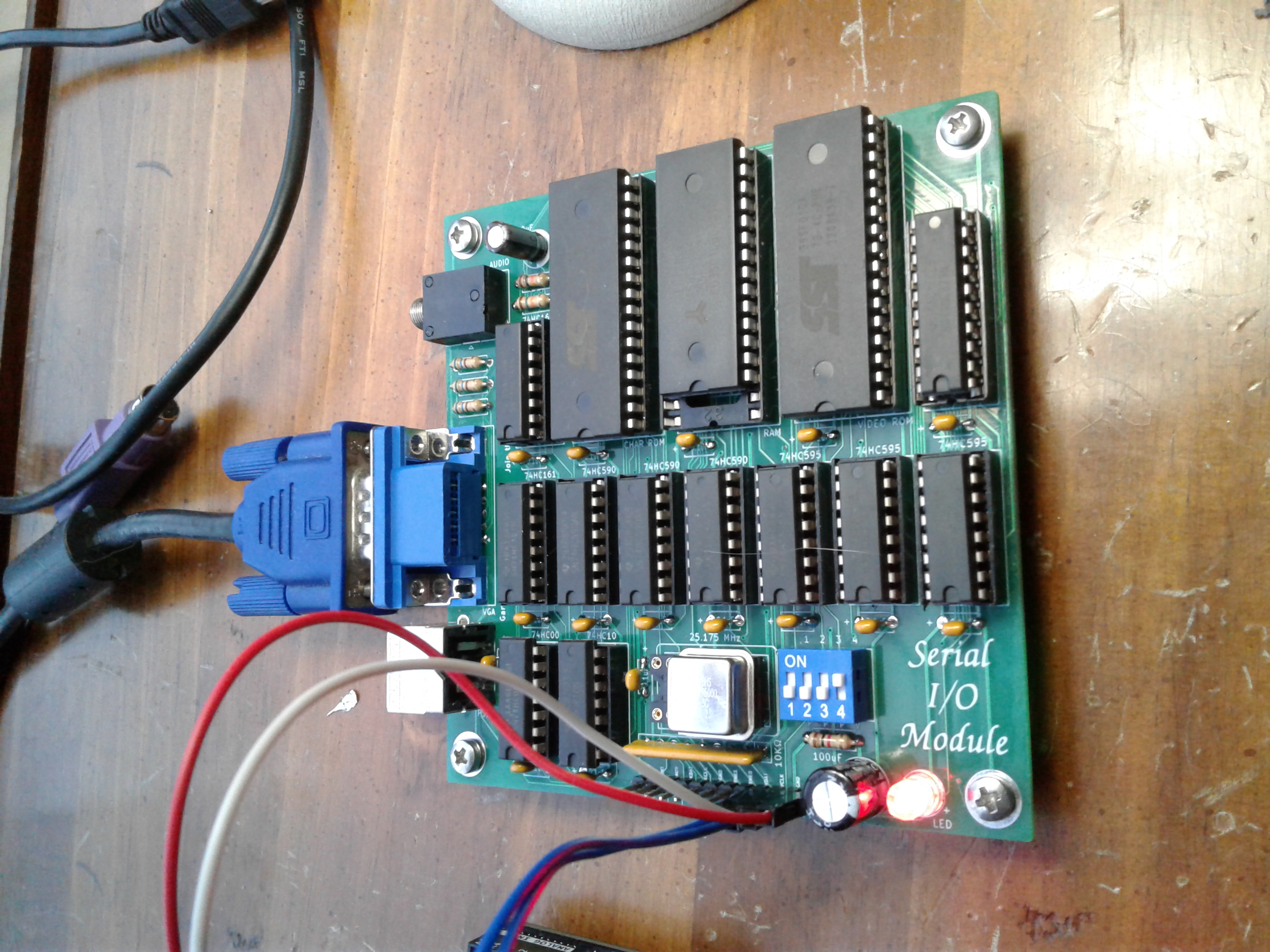 Just soldered my latest version of the Serial VGA board. And it worked the first time! Here I have the (new) Arduino connected to it. It is super easy to interface, as was the point of this project. I plan on testing it with my SBC sometime later.