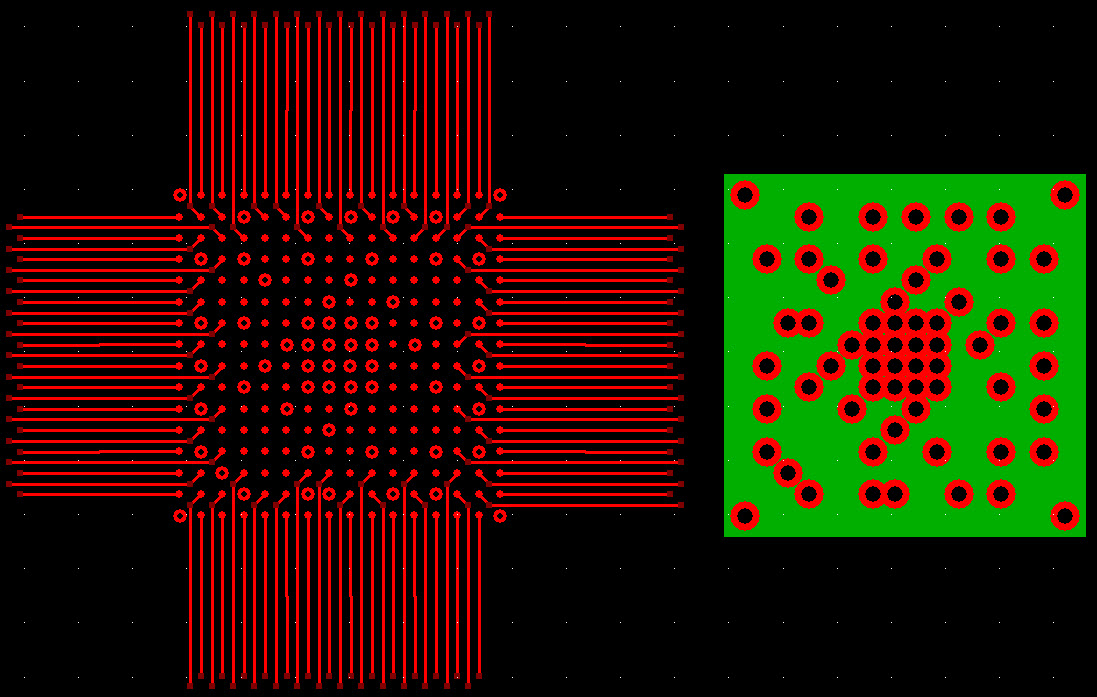 OK I have it figured out! I am jumping the gun, so to speak, as I don't even have a BGA board designed yet, but this topic of layered boards is very intriguing and something I must conquer immediately. I think it's going to work. I've triple checked pins and the design has been accepted by ExpressPCB. 620 holes vs. the 650 hole limit on ProtoPro 2-layer service.