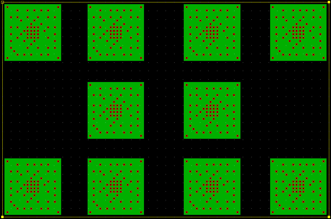 So I am eager to start production of my 3D bypass capacitor board, each .67"x.67" board will have 62 holes. Each of those holes will be a .056" via with a .029" hole. The 0605 caps will be a snug fit, since they are .065"x.032". Some things I have to consider are the number of holes per board. Max is 650 for ExpressPCB ProtoPro 2 layer service, the one that can't exceed 21sq". Which real estate is not the issue here, number of max hole is the limiting factor. So I can have multiple bypass cap boards on a single manufactured board. Looks like about 10. I will use extra holes remaing to make separation easier. $166 will get me 4x10 boards. I have to get the measurements correct the first time! I may have to go with the .065" via with the .035" hole.