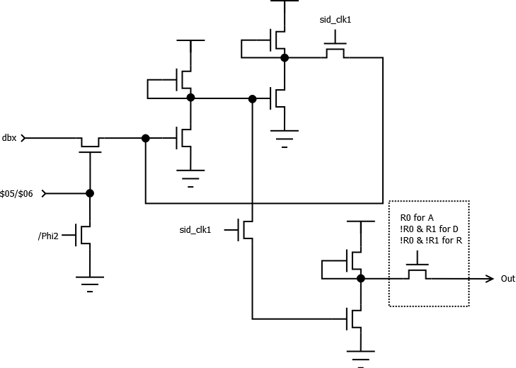 Those two FETs working as a voltage comparator during sid_clk1 =1