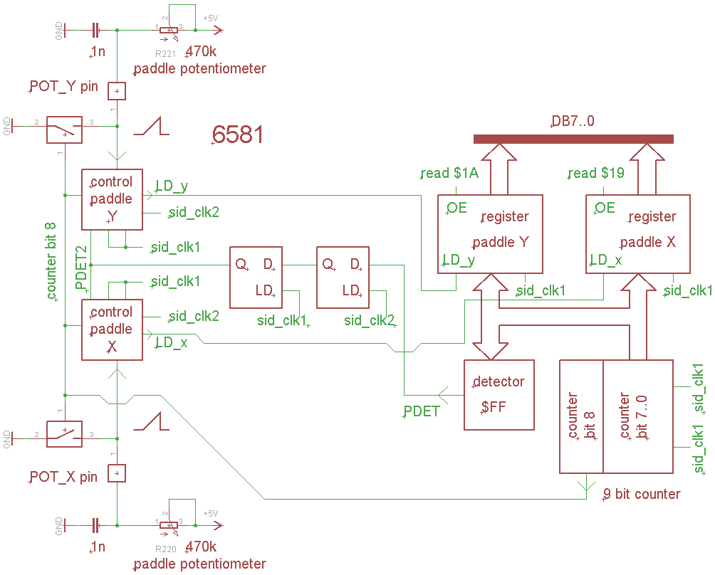 Bit 7..0 from the counter are fed into two 8 bit latches, POT_X and POT_Y.