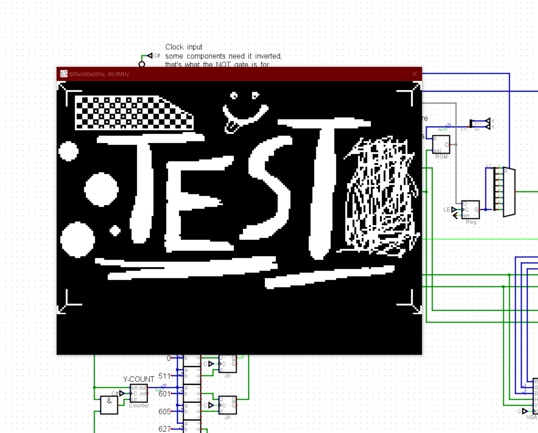 and if you really want to spend a lot of time, you could make a 25 byte array out of SN74x273's to have different colors for every character in a line, and every 8 lines it would read 25 additional bytes from RAM to update those for the following 8 lines. or maybe just control the foreground color and have a global background color per 8 lines, so you only need 12 8-bit registers instead of 25.