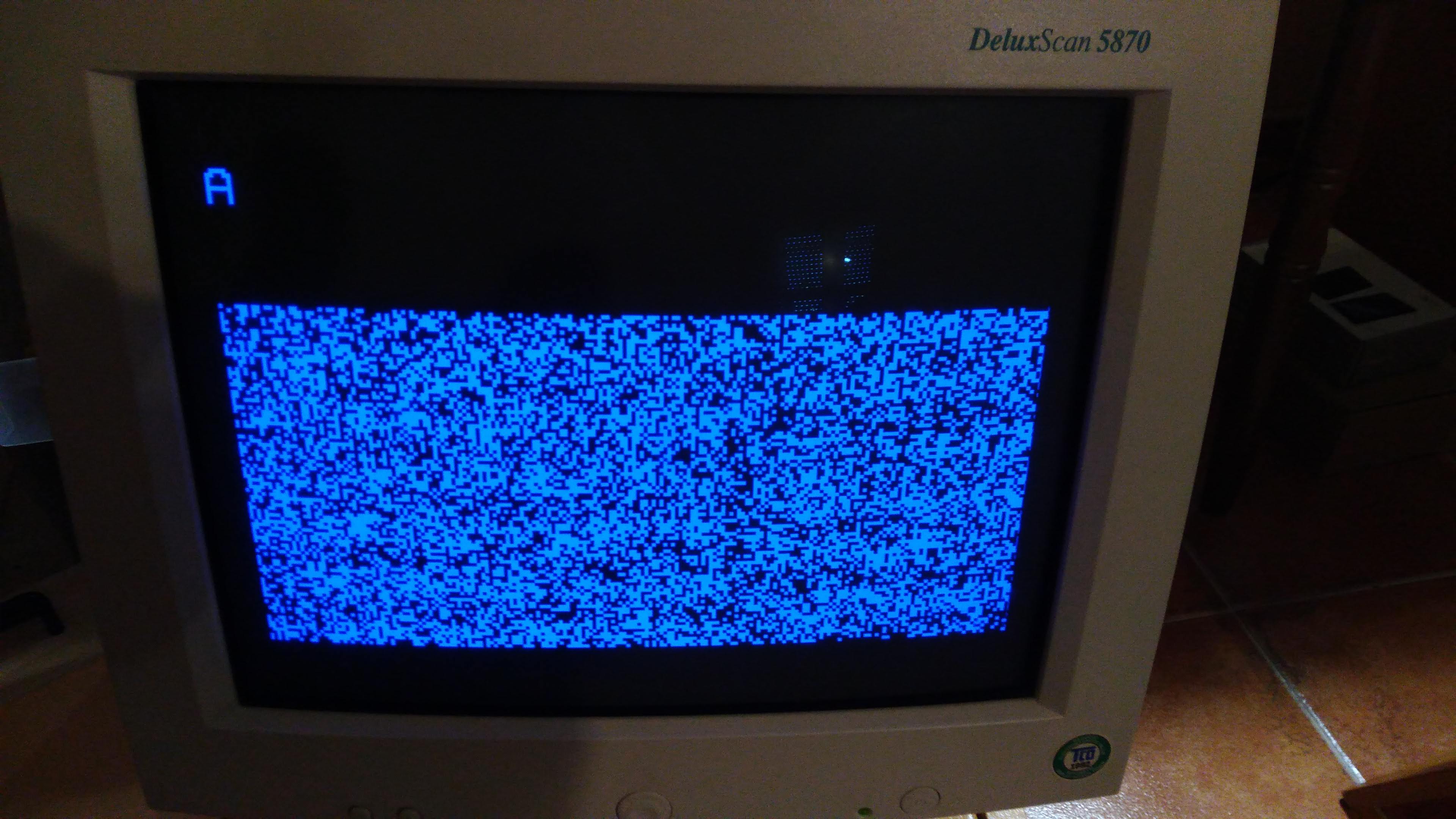 I now have to write subroutines for character output, scrolling and such. I thought about using PETSCII, but that would require 2K of ROM, and a look-up table to translate from ASCII. So I may use something like the ATASCII (https://en.wikipedia.org/wiki/ATASCII) character set, with printable characters matching ASCII, and "semi-graphic" characters on the control codes.