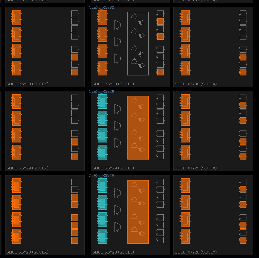 The control logic only uses 6 flops (the little squares on the right side of each slice), so it's mostly combinatorial logic.