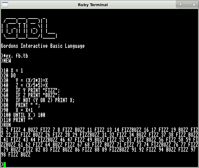 As you can see here, the FizzBuzz program I wrote earlier is now running. It takes about 2.5 million cycles, which isn't too bad considering this really isn't a performance-oriented interpreter.