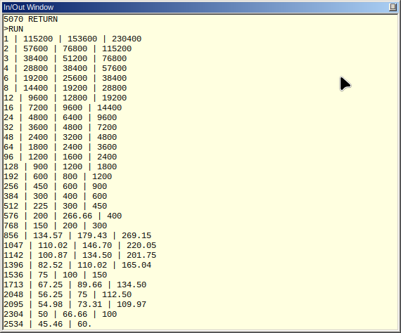 The output is a table of the baud rates for my "improved ACIA" proposal: