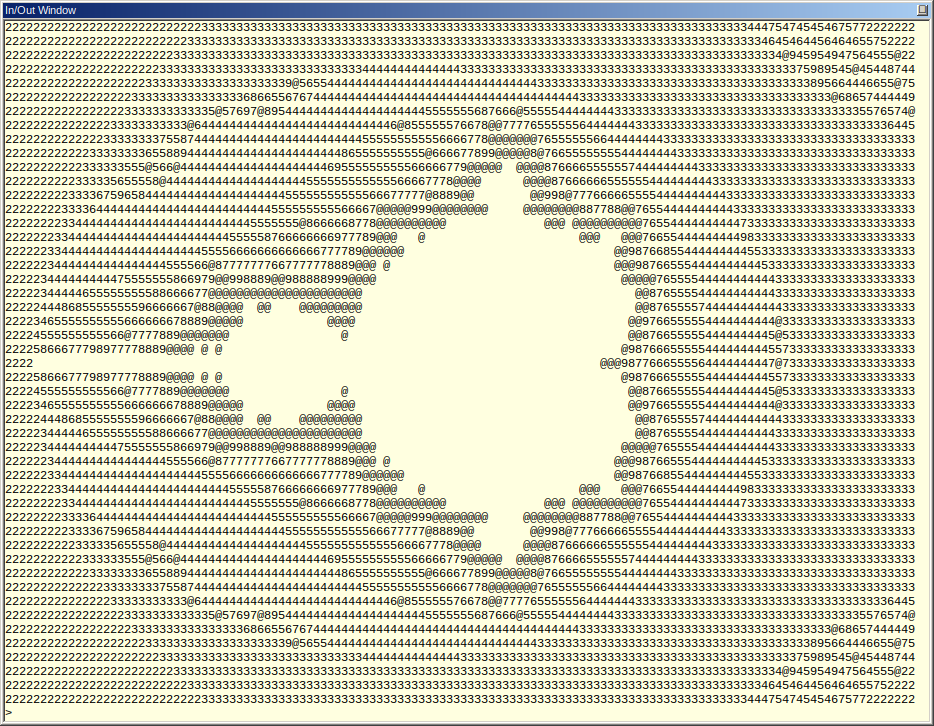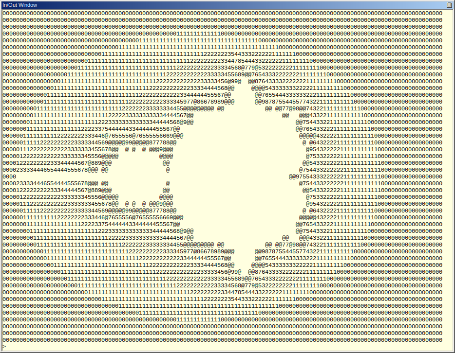 Another program showing off interesting features of the interpreter. Note that the code is not presented in execution order, but when pasted in it will effectively be sorted by line number. This takes approximately 1.2 million cycles to complete, and then executing the program takes several million more. The main features thus demonstrated/exercised are the memory management for program code, the use of 32-bit internal arithmetic to support fixed-point, and nested subroutine calls. In a more complete and conventional BASIC interpreter, this would be a natural place to use DATA and READ, which I don't have - nor is there an END or STOP, but a contrived GOTO past the end of the program also works.