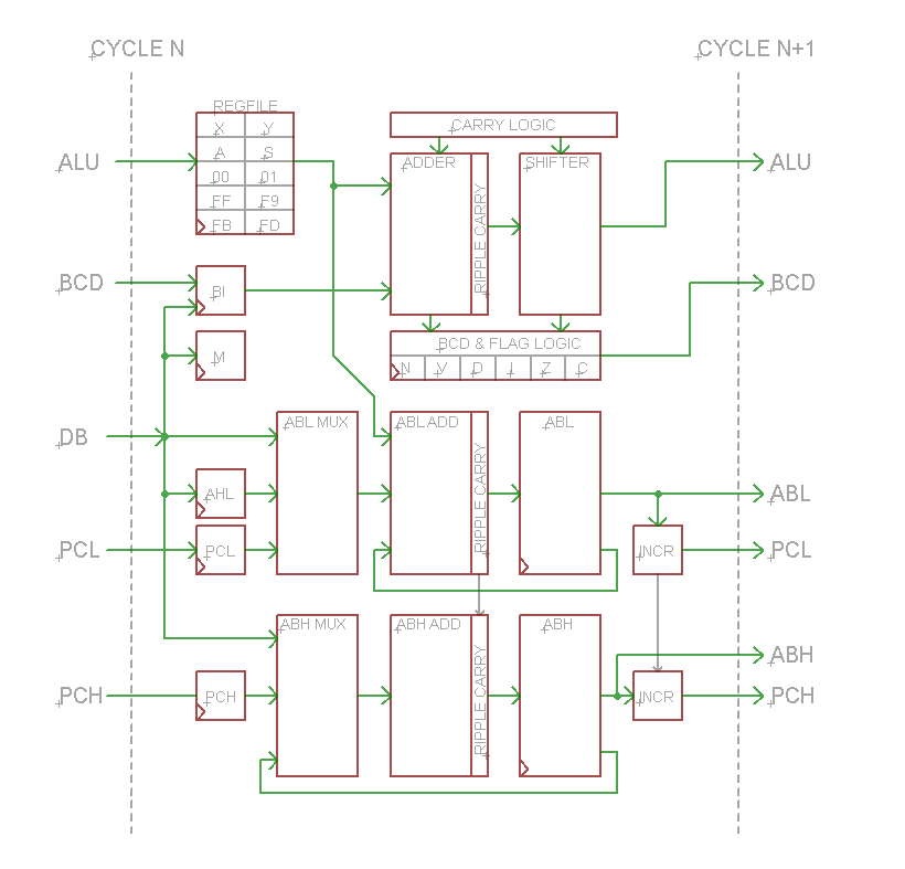 The blocks with the little '>' in the corner are registers. The output data on the right lines up with the input data on the left in the next cycle, except for the ABL/ABH on the right go into the memory, and then the DB on the left comes out.