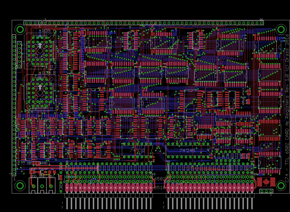 The design now feels like it's reached a nice milestone: a cycle-accurate, pin-compatible 6502/6510/65C02 TTL processor capable of modern clock-rates. The instruction set is selectable on distinct ROM banks and various other jumpers do the rest. If all this works, the CPU should be able to plug directly into either NMOS or CMOS 6502-based computers and run without any appreciable difference ... that's pretty amazing to me, and well beyond my original goals. :D (it's also more than a little amusing to think that all this work is merely to replicate what the original chip does but in a much larger and cumbersome package. :roll:)