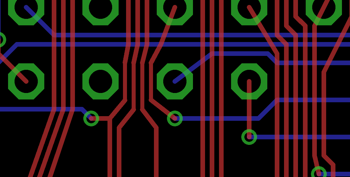 As it happens, I'm using 6 mil width, 5 mil clearance and a 13 mil drill size most of the time (not sure why, but so it is). The traces between the two pins of the PLCC44 socket are in fact 5 mil width/5 mil clearance - just taking OSH Park at their word and hoping for the best. I have very little prior experience with this (as in none) so I'm very open to any and all suggestions on all matters PCB! Please don't hesitate to point out anything that looks dodgy. Chances are I am not aware of it :oops:.